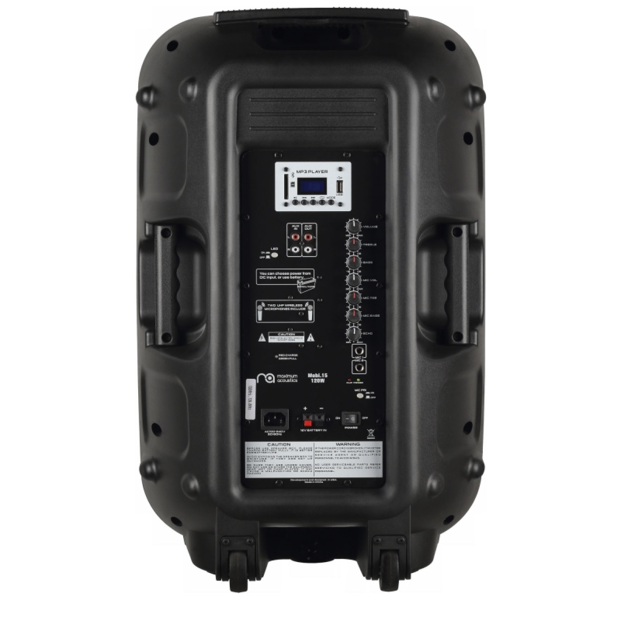 Система с простым кнопочным управлением, которое находится на задней панели и дисплей. Maximum Acoustics Mobi.15 имеет 2-полосный эквалайзер для выходного сигнала с регулятором громкости и 2-полосный эквалайзер с регулятором громкости отдельно для микрофонов.  С помощью ручек Echo и Treble есть возможность добавлять эффекты звучанию. Индикация уровня заряда батареи производится LED.
