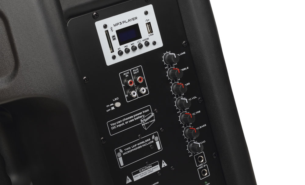 Данная система способна работать как от источников постоянного и переменного тока, так и от батареи. Номинальная мощность данной системы 120 Вт. Оборудована: усилителем D класса, динамиком 15" с катушкой 1,5" и магнитом в 30 унций, титановым ВЧ-компрессионным драйвером - 25 мм. Может управляться с помощью пульта дистанционного управления который входит в комплект. Также в комплект входят беспроводные UHF-микрофоны (2 штуки).