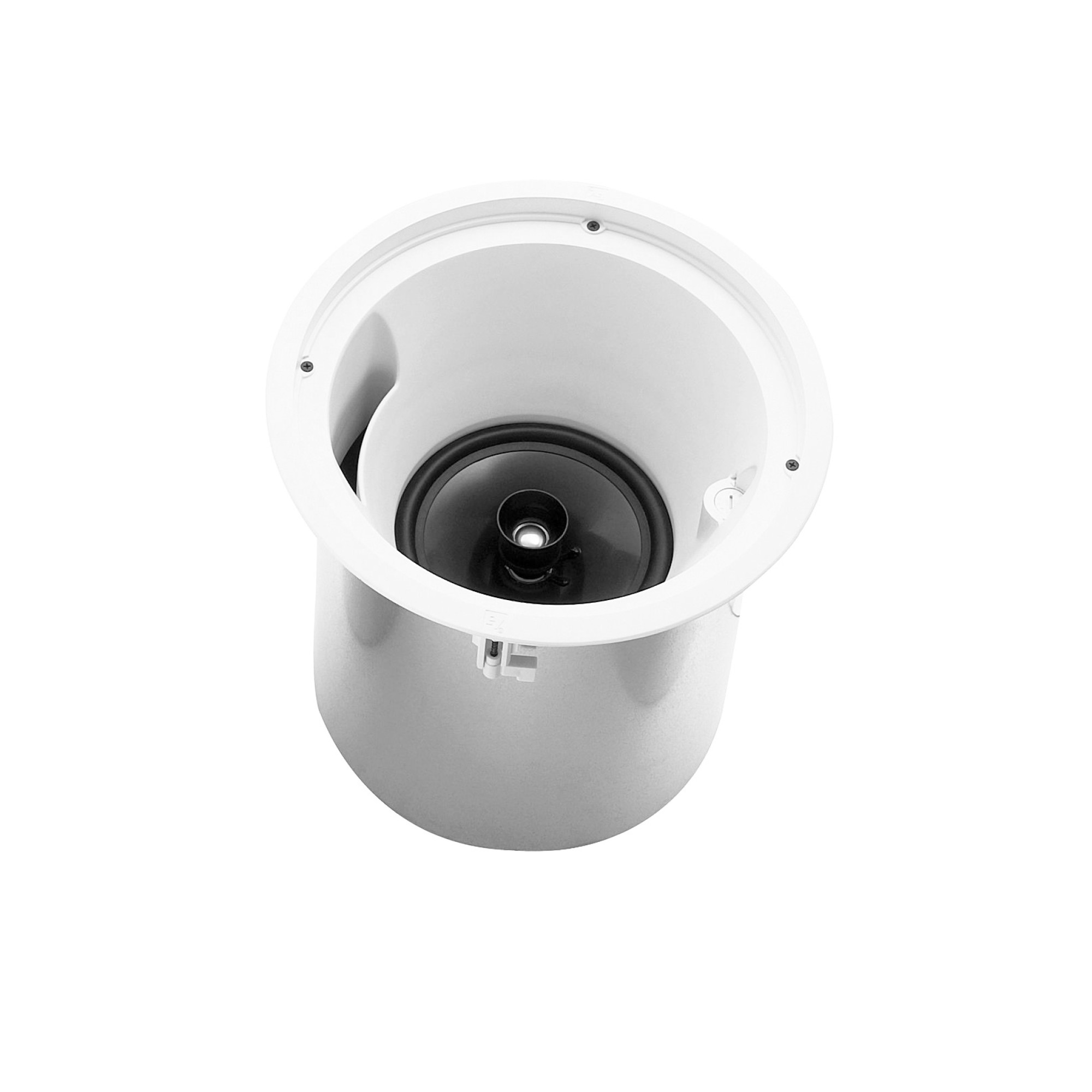 Electro-Voice EVID C8.2HC – это 8-дюймовый коаксиальный излучатель с инновационным волноводом, обеспечивающим регулировку направленности до 1 кГц. Он обеспечивает гораздо более высокую точность воспроизведения музыки и разборчивость речи в помещениях с большой высотой потолков, чем это могут сделать обычные скрытые громкоговорители. Его диаграмма направленности 75° обеспечивает такую же площадь покрытия при использовании в потолке высотой 6,5 метров, как и типичная скрытая установка в потолке высотой 2,5 метра. Комплект состоит из панели/волновода, решетки, заднего корпуса, 8-дюймового коаксиального двухполосного громкоговорителя с купольным твитером с титановым покрытием, соединенным с волноводом, и внутреннего линейно-согласующего трансформатора. В C8.2HC используется трансформатор, который позволяет выбрать мощность 7,5 (только 70 В), 15, 30 или 60 Вт, подаваемую на акустическую систему по линиям 70 или 100 В, или в обход 8 Ом. Выбор осуществляется с помощью удобного переключателя на передней панели. Перфорированная решетка окрашена полуглянцевой белой эмалью с порошковым покрытием. Передняя панель и ободок изготовлены из ABS-пластика с классом защиты UL 94V-0. Задний корпус с демпфирующим материалом из стекловолокна обеспечивает оптимальный внутренний объем для расширенного воспроизведения низких частот. Задняя крышка с отверстиями для установки распределительной коробки обеспечивает доступ к 4-контактному клеммному блоку, который позволяет напрямую подключать АС проводом 12 калибра и передавать сигнал на дополнительные АС.