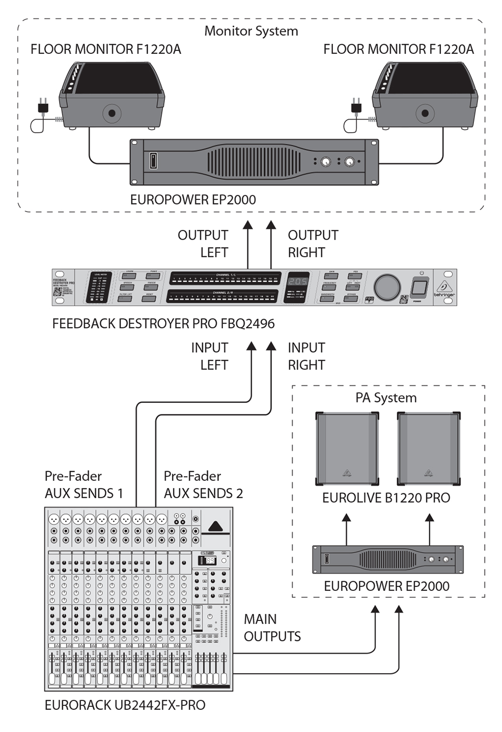 FBQ2496 в канале монитора. Благодаря своей 2-х канальной конструкции FBQ2496 является идеальным прибором для использования в двух каналах мониторов. Для этого соедините, как показано на рисунке, выходы Pre-Fader Aux Send микшерного пульта со входами FBQ2496. Входы конечных ступеней мониторов подключаются к выходам FBQ2496.