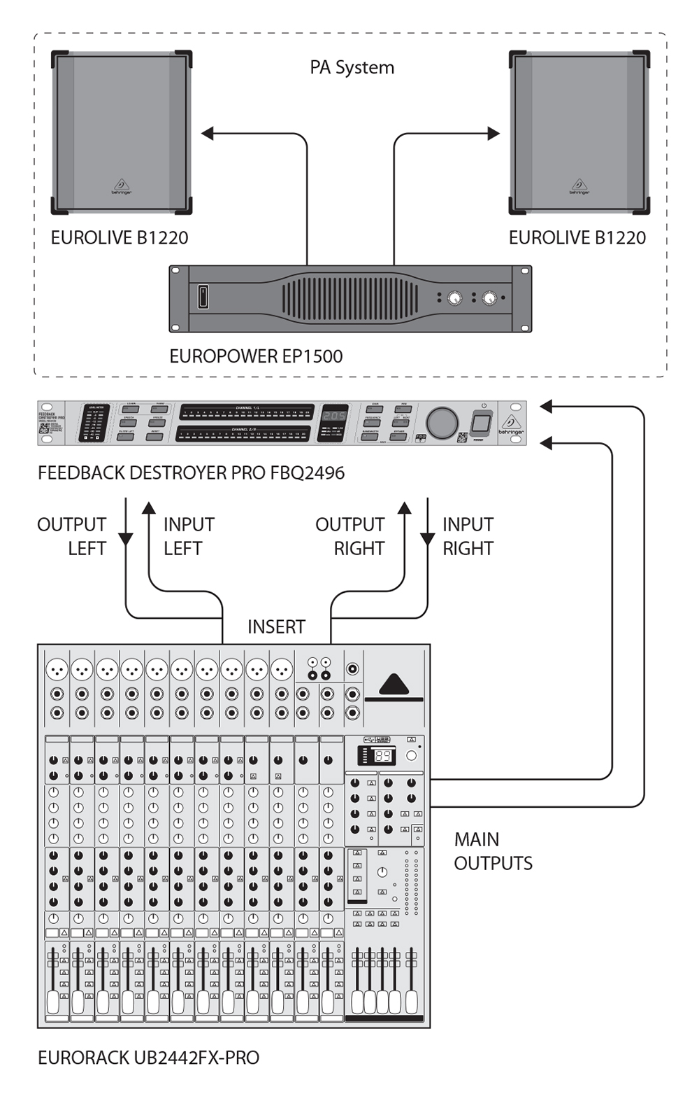 Если Ваш микшерный пульт не имеет подгруппового разъема Insert, то мы рекомендуем подключить FBQ2496 следующим образом: соедините подгрупповой выход со входом FBQ2496. Соответствующий выход подключите к свободным линейным входам микшерного пульта или к входам Aux Return микшера. Kогда два канала FBQ2496 не связаны друг с другом, можно использовать второй канал FEEDBACK DESTROYER PRO для других целей (например, на канале Insert).