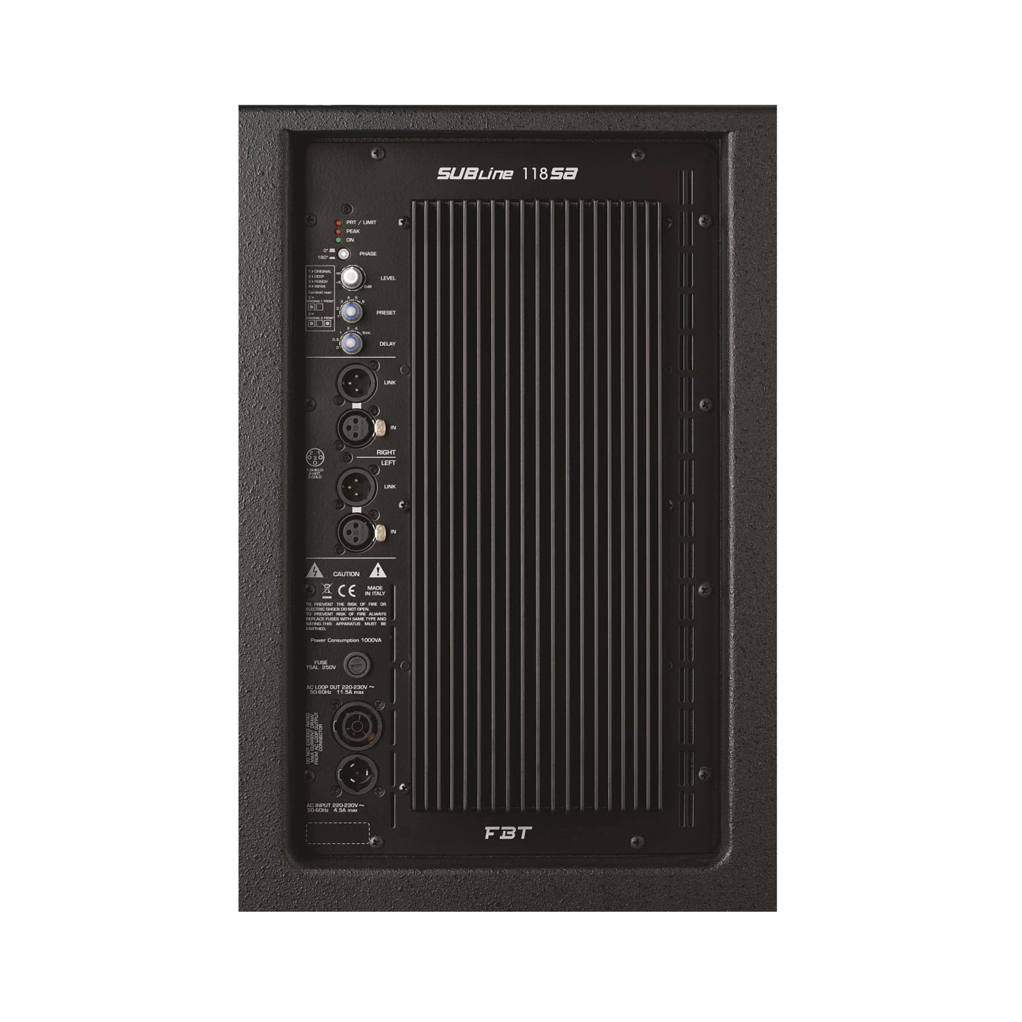 Процессор звукового давления с шестью вариантами (пресетов), превращает одну систему в множество абсолютно разных. Усилитель D-класса, с впечатляющим показателем мощности в 1200 Вт, прекрасно подойдет для озвучивания, как площадок, так и помещений совершенно разной величины. На задней панели расположен стерео XLR/Jack комбо вход/выход, стерео XLR выход, ручка регулировки громкости и выбора вариантов пресета, и три световые индикаторы состояния системы. Если Вам необходимо расширить низкочастотную составляющую своей системы, то FBT SUBLINE 118SA станет неплохим решением, благодаря своей надежности и полностью европейскому происхождению.