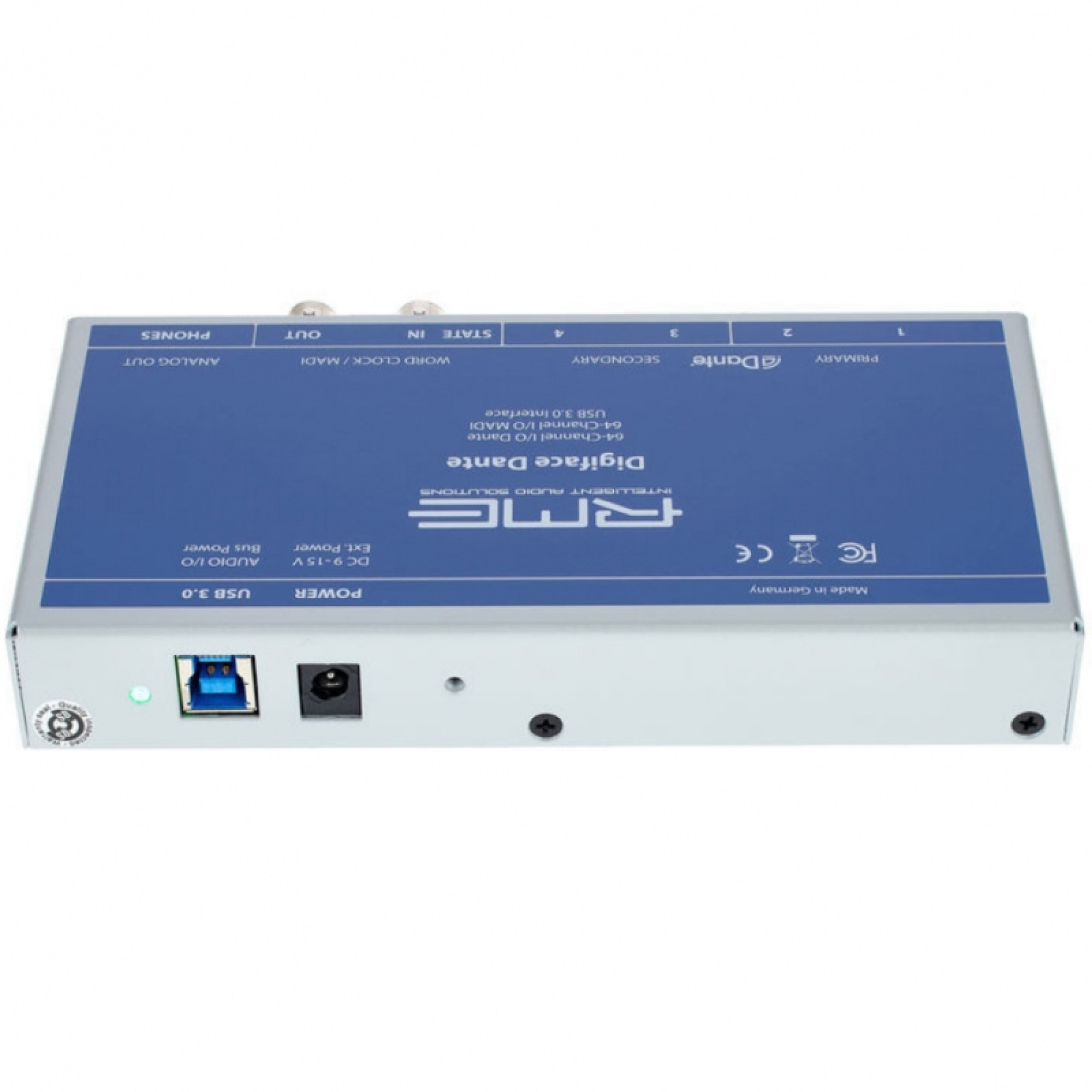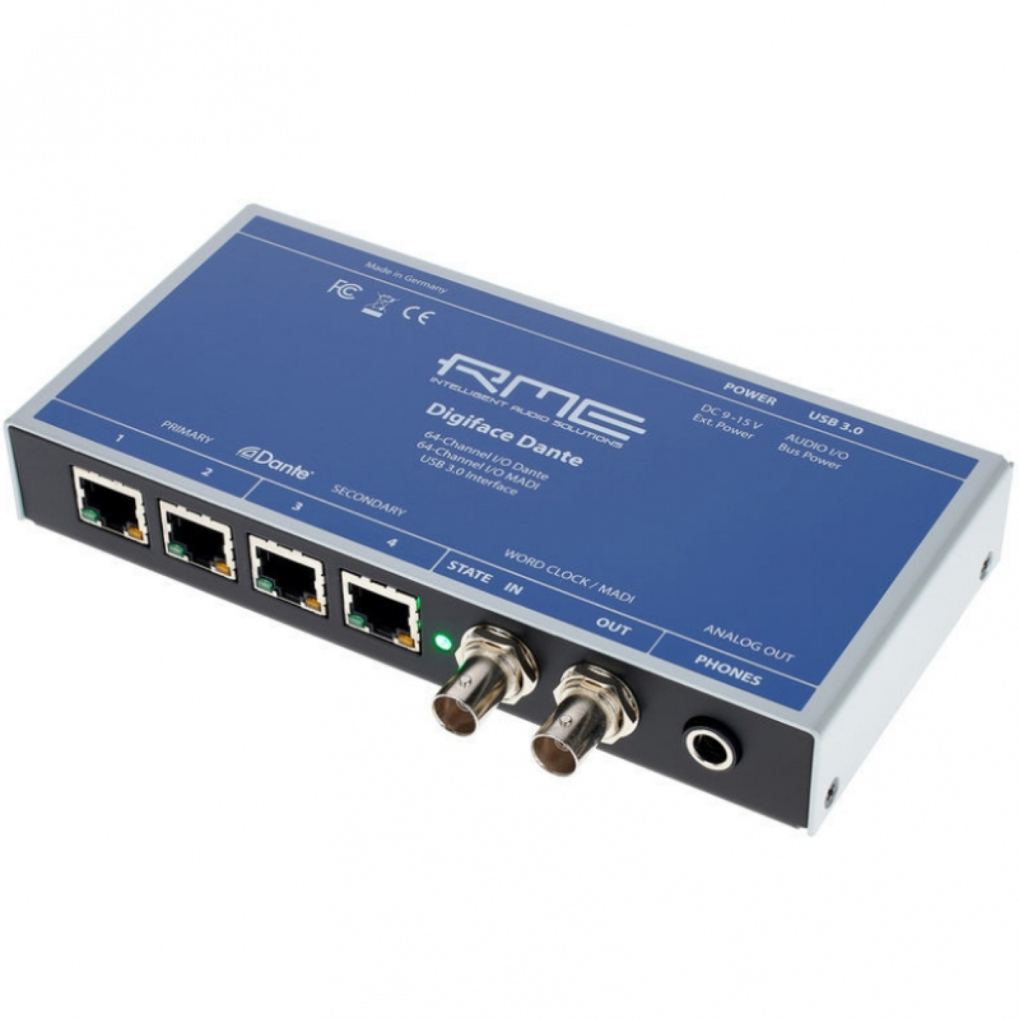 Данный интерфейс предлагает один выход для наушников, четыре порта Gigabit Ethernet (802.3 совместимые) и один коаксиальный вход/выход MADI. Сигналы передаются через шину USB 3.0, обеспечивая передачу до 64 каналов Dante и 64 каналов MADI одновременно. Благодаря возможности внешней синхронизации через BNC разъемы, которые могут быть переключены в режим MADI, интерфейс может работать с общим количеством 128 каналов в двух форматах.