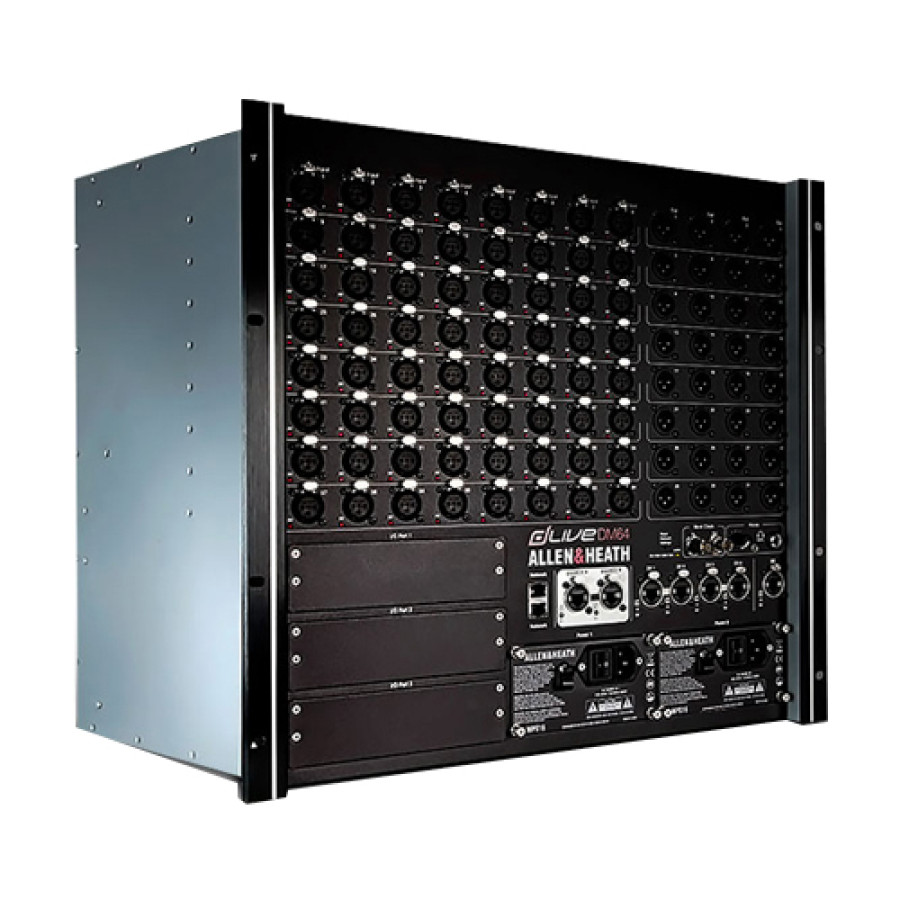Allen & Heath DM64 - это микшерный рек-блок, размером 4U, как и другие реки dLive, укомплектован процессором XCVI FPGA, что обеспечивает достаточно мощности для обработки 128 каналов и 64 шин при частоте дискретизации 96 кГц с задержкой прохождения сигнала менее 0,7 мс . Модели линейки DM отличаются друг от друга только количеством аналоговых входов и выходов. DM64, например, оснащен 64 входными отверстиями и 32 линейными выходами.