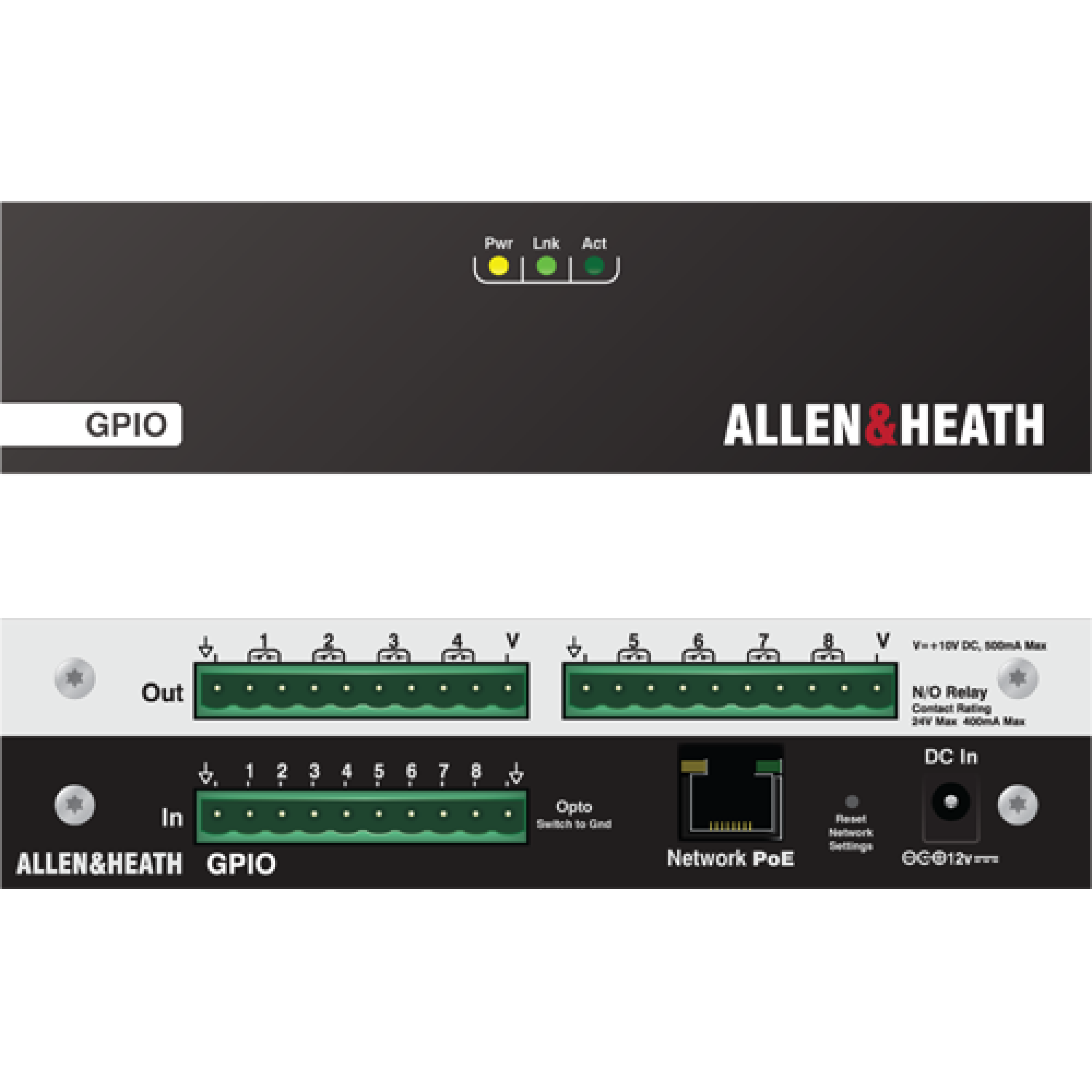 GPIO является универсальным интерфейсом для коммутации входов/выходов для управления интеграцией системы dLive и сторонних аппаратных средств, предлагая 8 оптоволоконных входов и 8 релейных выходов на разъемах Phoenix в дополнение к выходам постоянного тока 2x + 10 В.
