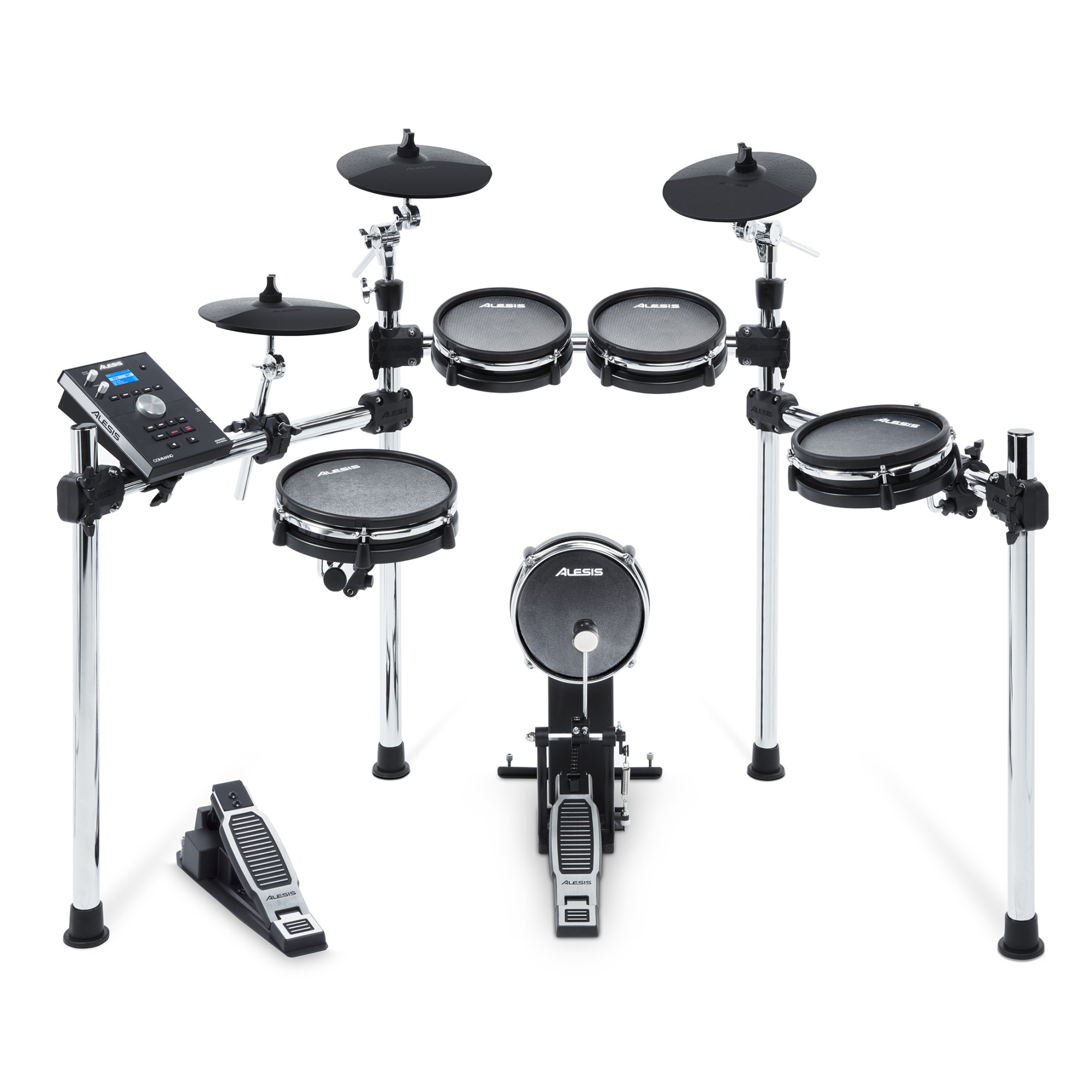 Alesis Command Mesh Kit комплектується надійним хромованим реком і здатний вистояти навіть перед самим експресивним барабанщиком. Крім цього в комплект входять: педаль для бас-барабана, всі необхідні кабелі та адаптери, ключ для барабанів і навіть пара паличок.