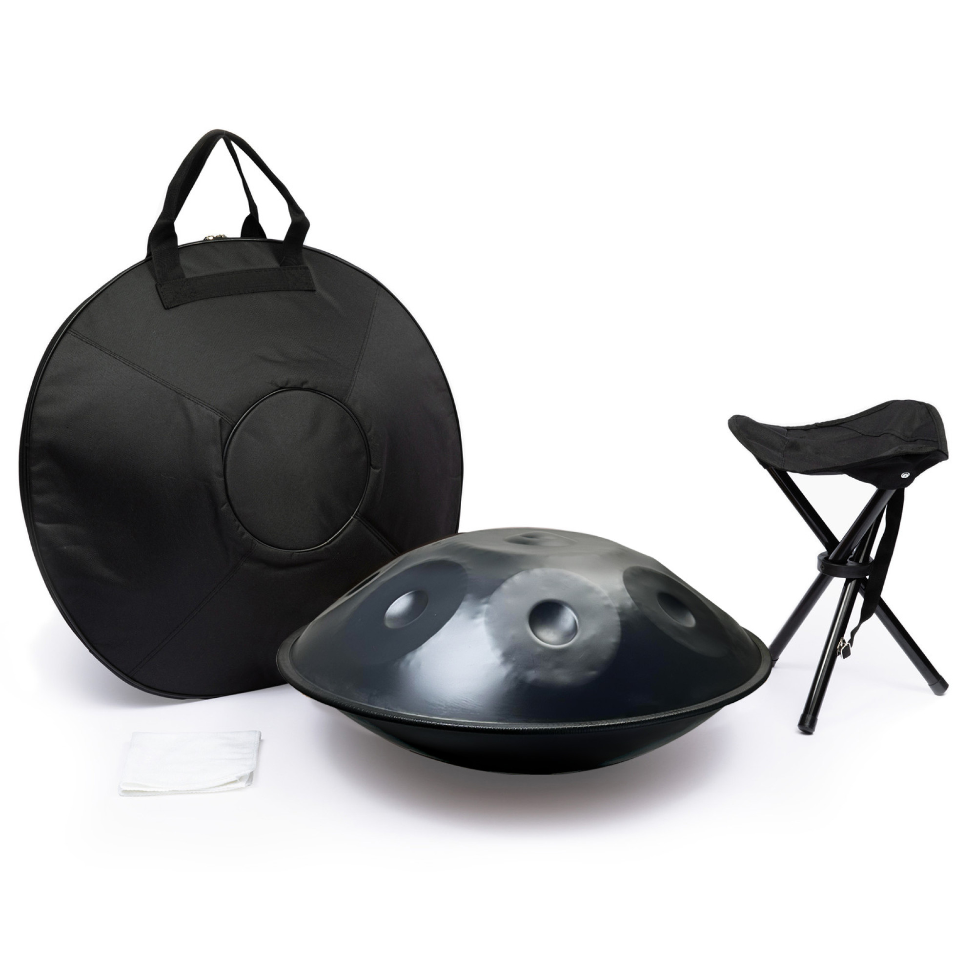 Комплектація ханга Alfabeto 2210-E Minor включає в себе чохол для зручного транспортування та зберігання, стійку із дерева або металу (матеріал стійки в комплектації залежить від надходження, додатково уточнюйте в менеджера), що допомагає підтримувати хендпан під час гри, серветку для догляду за інструментом, щоб забезпечити його чистоту та довговічність, а також інструкцію користувача для того, щоб навчитися грати та доглядати за ганґом належним чином.