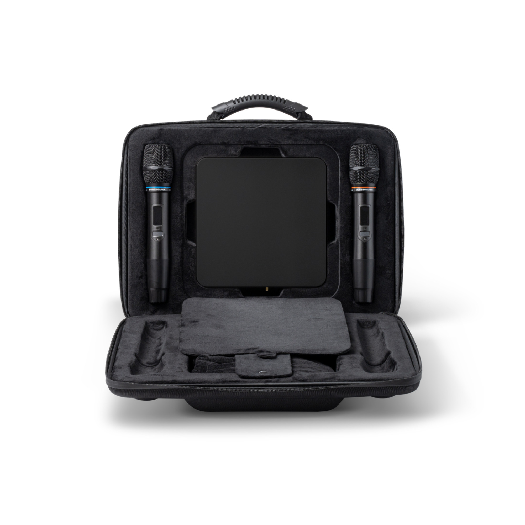 2 бездротові мікрофони, Bluetooth пульт ДК, 2x Аудіокабелі RCA-RCA, Кабель HDMI, Блок живлення, Кейс, Посібник користувача