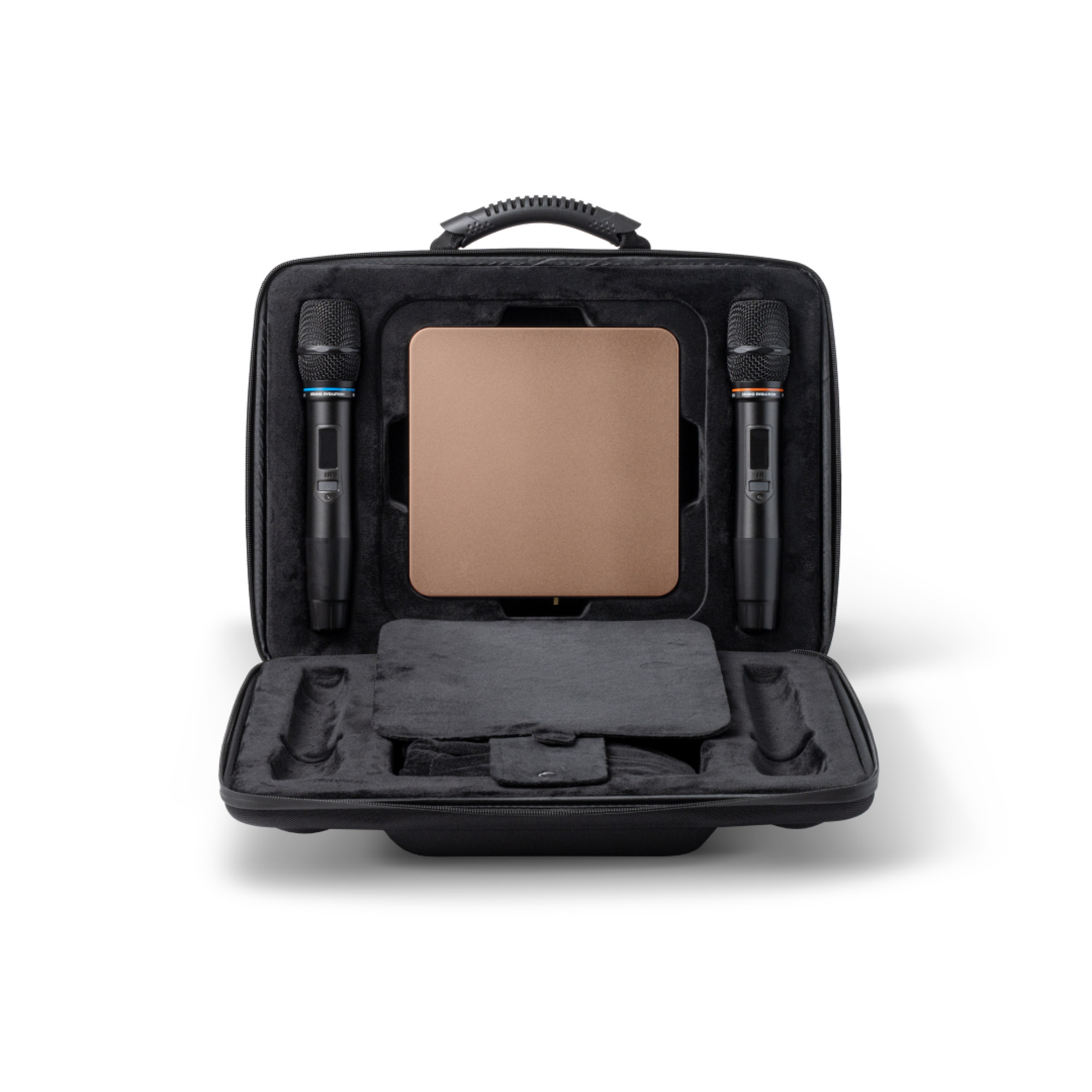 2 бездротові мікрофони, Bluetooth пульт ДК, 2 x аудіокабелі RCA-RCA, кабель HDMI, блок живлення, кейс, посібник користувача