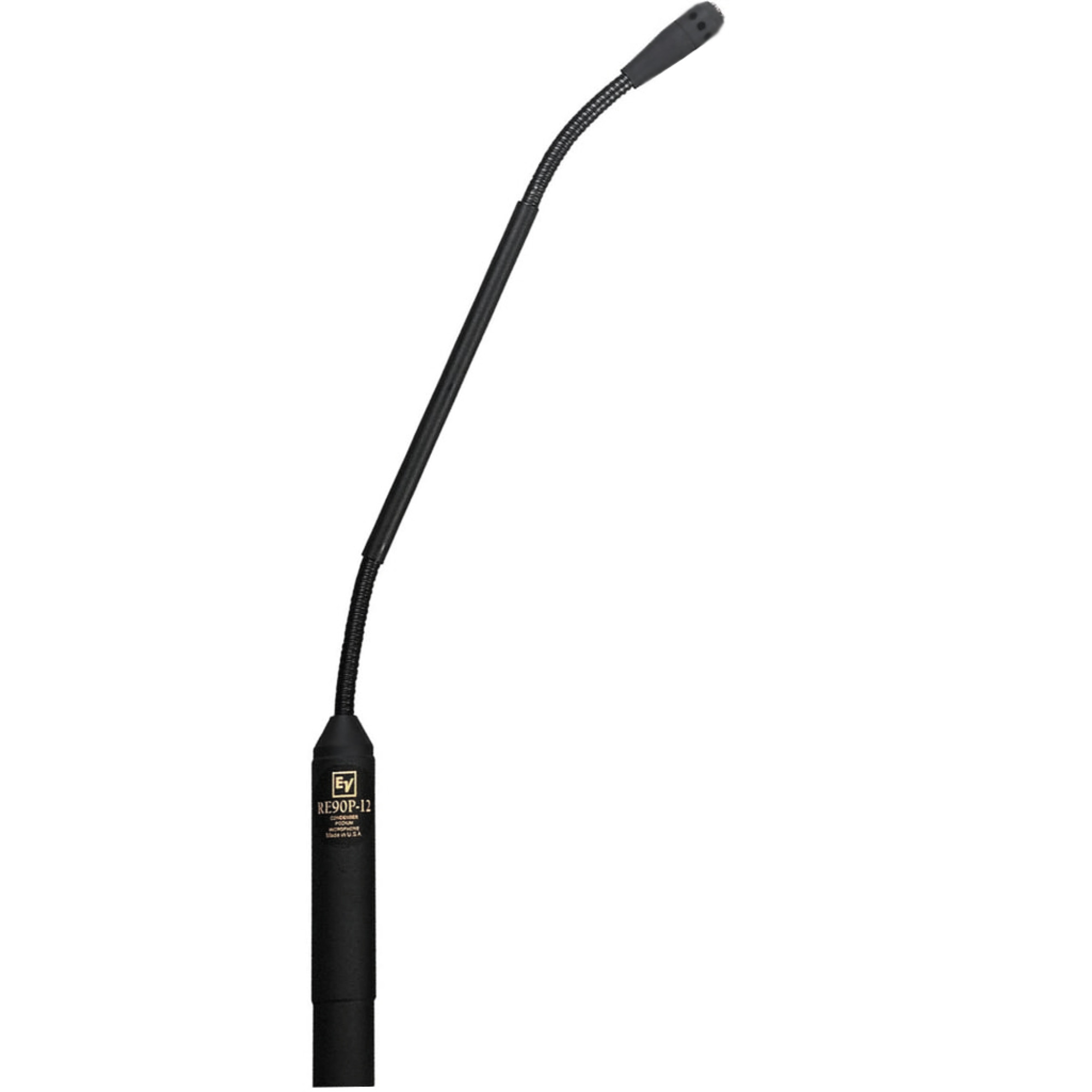 Electro-Voice RE90P-12 є мініатюрним конденсаторним мікрофоном з гусячою шиєю. Зворотний електрет забезпечує більшу чутливість, ширшу частотну характеристику та кращий захист від перешкод, ніж у мембранно-електретних мікрофонів. RE90P-12 має високий ступінь захисту від радіочастотних/GSM-перешкод і механічно призначений для швидкого та зручного монтажу. Для стаціонарної інсталяції також пропонуються додаткові аксесуари для фіксованого (комплект FMK для фланцевого монтажу) та ударного монтажу (комплект CPSM для ударного монтажу). Частотна характеристика розрахована на відтворення повнодіапазонного звуку з природним звукознімачем, оптимізованим для роботи з близької відстані. Мікрофон має два гнучкі шарніри та жорстку центральну трубку. Корпус має основу діаметром 3/4 дюйми з 3-контактним роз'ємом типу XLR, який дозволяє підключати мікрофон безпосередньо до існуючої розетки XLR панельного монтажу. У вихідному ланцюзі мікрофона використовується безтрансформаторна балансова конструкція з низьким вихідним опором, що зазвичай становить 200 Ом. Це дозволяє прокладати довгі кабелі без погіршення характеристик мікрофона. Мікрофон RE90P-12 розрахований на фантомне живлення з широким діапазоном напруги 9-52 В постійного струму (стандарт DIN 45596).