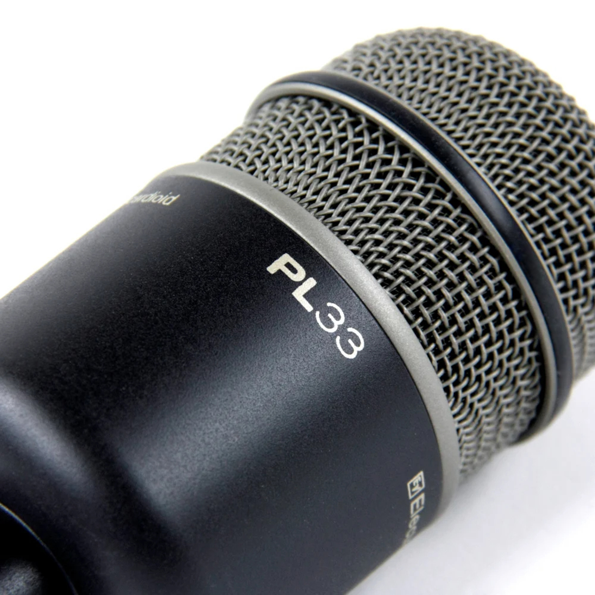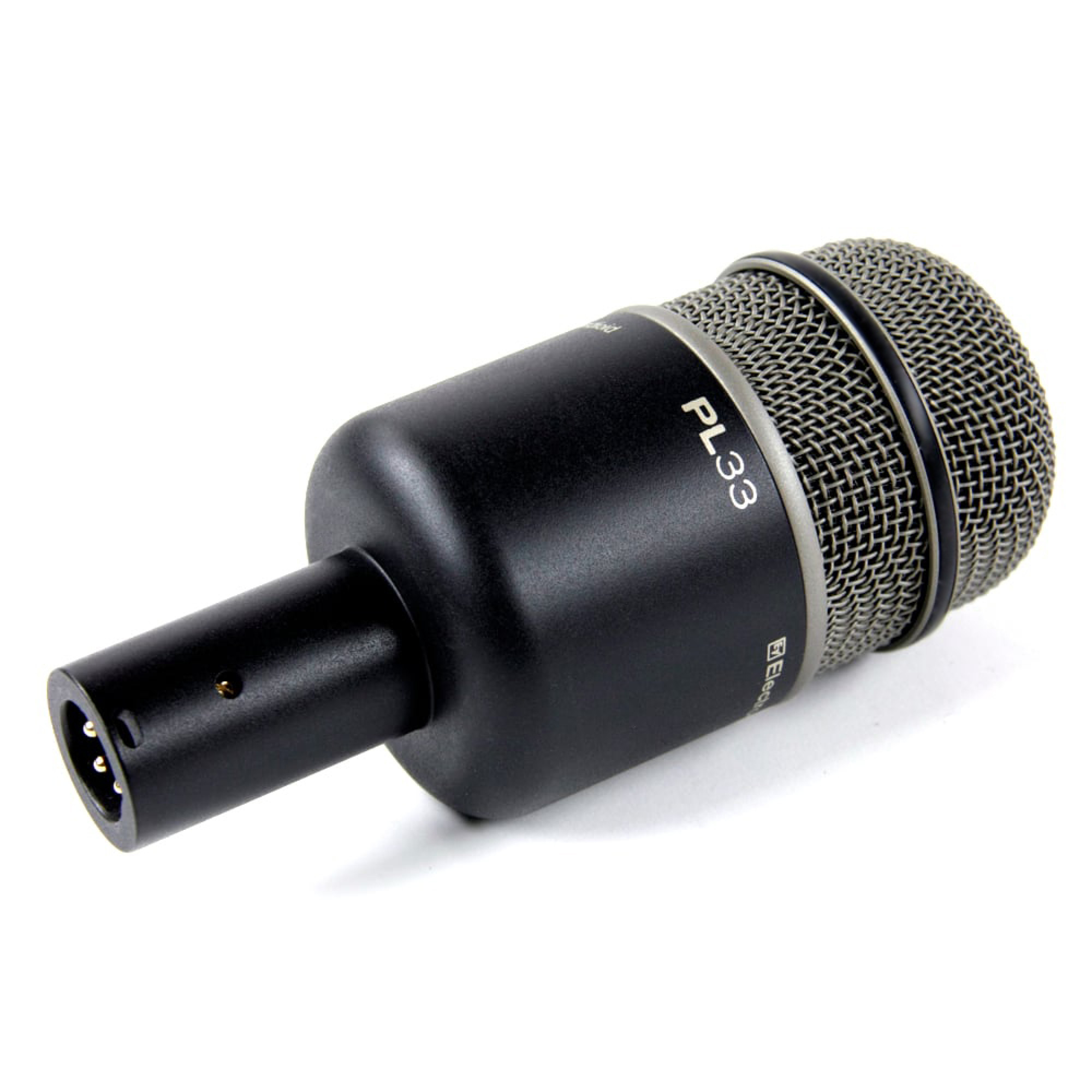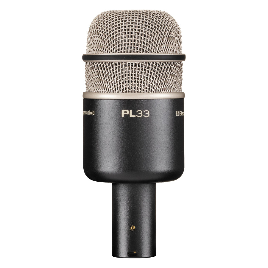 Electro-Voice PL-33 – це суперкардіоїдний динамічний мікрофон, який призначений для ударних інструментів у системах звукопідсилення чи студіях звукозапису будь-якого розміру. Його частотна характеристика стратегічно продумана так, щоб забезпечити чудове звучання ударних барабанів без додаткової еквалайзерної обробки. PL33 забезпечує передачу всіх деталей ударної установки, що необхідні професійним барабанщикам та інженерам звукових систем. Щільна суперкардіоїдна полярна діаграма спрямованості PL33 розроблена для мінімізації позаосьової інформації, що потрапляє в капсуль, і дозволяє отримати дуже ізольоване звучання інструменту та більш високий рівень посилення перед зворотним зв'язком. Хоча PL33 розроблений як мікрофон для ударних інструментів, він також добре працює як мікрофон для низьких томів та кабінетів бас-гітар.