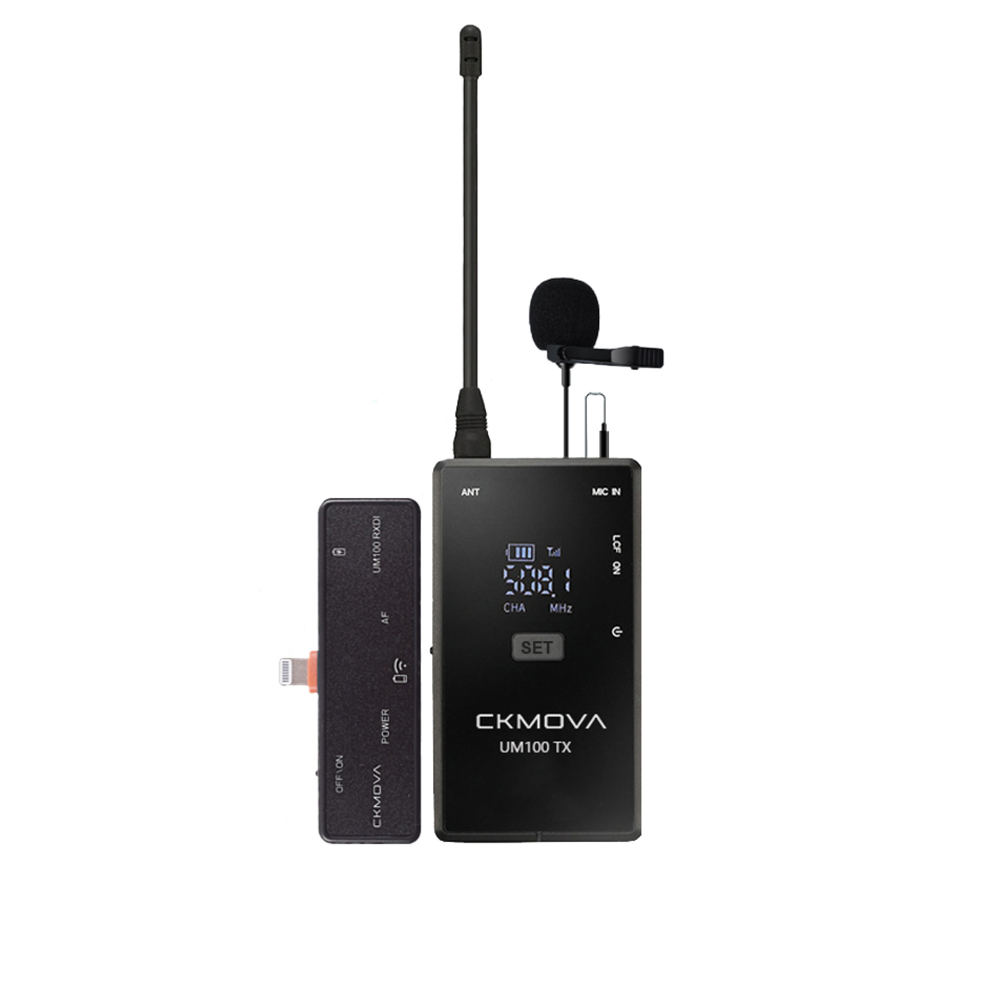 CKMOVA UM100 Kit5 – це компактна бездротова мікрофонна система, яка забезпечує високоякісний звук для користувачів практично в будь-якому сценарії. Це просте рішення для блогерів, інтерв'ю та прямої трансляції в поєднанні, наприклад, із дзеркальною камерою, смартфоном або комп'ютером. UM100 Kit5 поставляється з одним передавачем (UM100 TX) та одним приймачем (UM100 RXDI), сумісним з iPhone та іншими девайсами з роз'ємом Lightning. Система має 20 каналів і автоматичне сполучення для швидкої та простої роботи. Передача даних здійснюється бездротовим шляхом від передавача до приймача на відстані 50 м. Діапазон частот бездротової мережі становить 470-510 МГц/550-590 МГц.