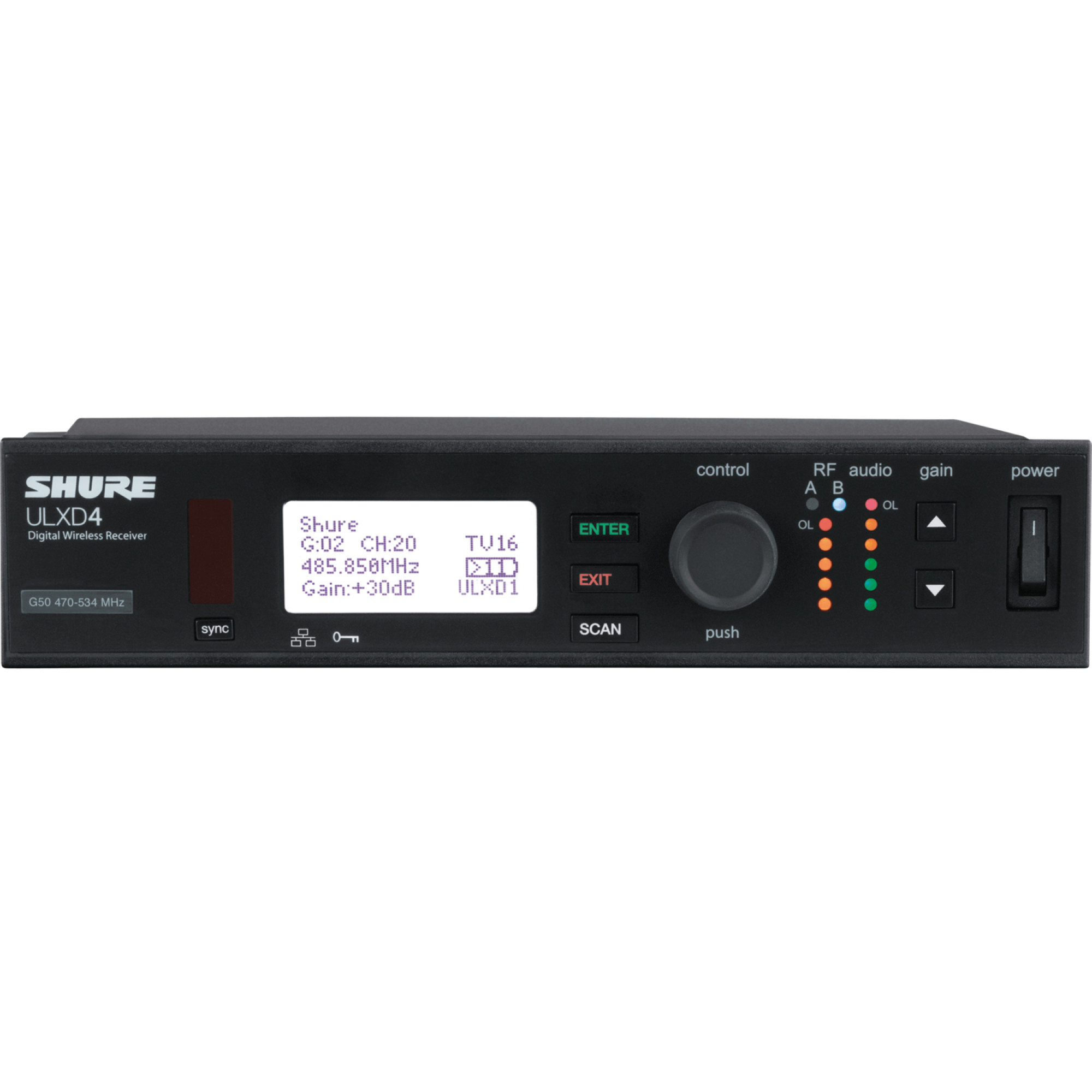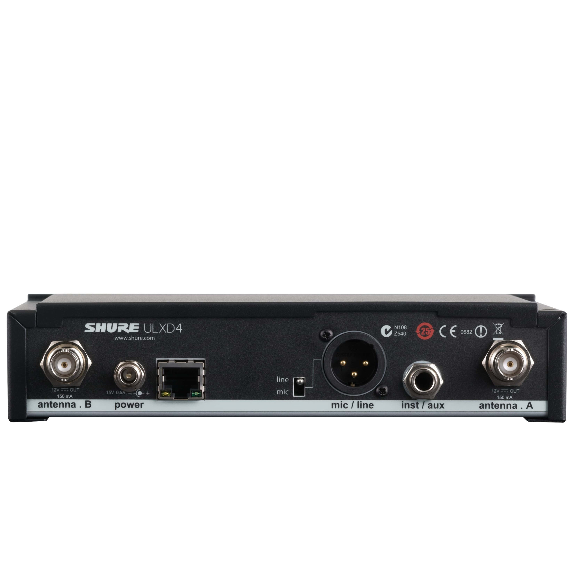 Shure ULXD4 – це цифровий бездротовий приймач для використання в будь-яких професійних системах звукопідсилення. Маючи широкий вибір професійних функцій, включаючи якість цифрового звуку 24 біт/48 кГц, ефективну та інтелектуальну радіочастотну характеристику та 256-бітове шифрування AES, ULX Digital пропонує безкомпромісний бездротовий зв'язок, призначений для професійного звукопідсилення. Великий РК-дисплей та інтуїтивно зрозумілі елементи керування дозволяють швидко виконувати налаштування навіть за умов недостатнього освітлення. Пристрій оснащений аудіо- та ВЧ-вимірювачами, регулятором посилення, а також виходами XLR і 1/4". Додаткові функції включають автоматичне сканування частот, ІЧ-синхронізацію, оптимізацію посилення під будь-яке джерело вхідного сигналу і внутрішнє обмеження для запобігання кліпування. Порт Ethernet дозволяє легко об'єднати декілька приймачів у мережу для спрощення координації частот та розгортання системи за допомогою програмного забезпечення Shure Wireless Workbench. Крім того, мобільна програма Channels дозволяє керувати системою віддалено з пристрою iOS.