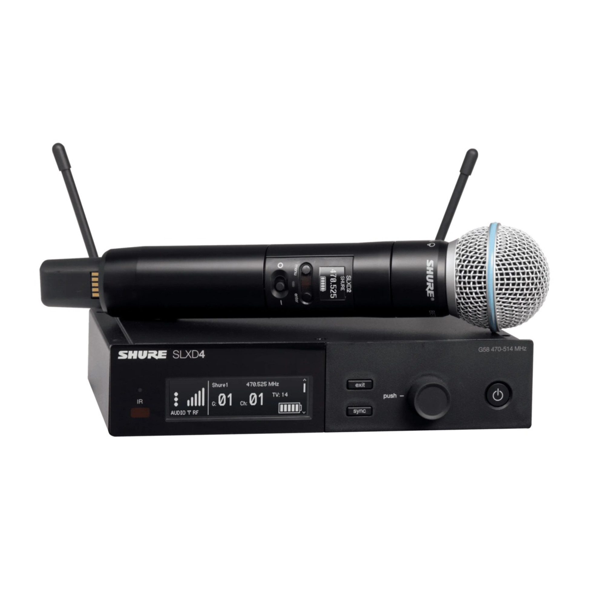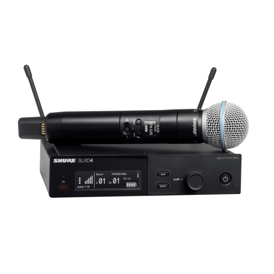 Мікрофон Beta 58 із суперкардіоїдною діаграмою напрямленості забезпечує чіткий і чистий звук, а передавач SLXD2, на якому даний мікрофон встановлений, робить його максимально зручним у використанні. Захисна металева решітка є надзвичайно міцною, а поп-фільтр забезпечує чітке розбірливе мовлення. Ця радіосистема дарує прозорий цифровий звук і стабільність радіочастот, завдяки чому кожен звук буде передано без втрат і спотворень. Дисплей на ручці мікрофону показує рівень заряду а також має клавішу ввімкнення та вимкнення і кнопки налаштування. Зручна синхронізація через ІЧ-порт і можливість працювати до 8 годин безперервно від двох батарей типу АА або акумулятора Shure SB903 робить цю радіосистему ще більш привабливою для професіоналів і любителів.