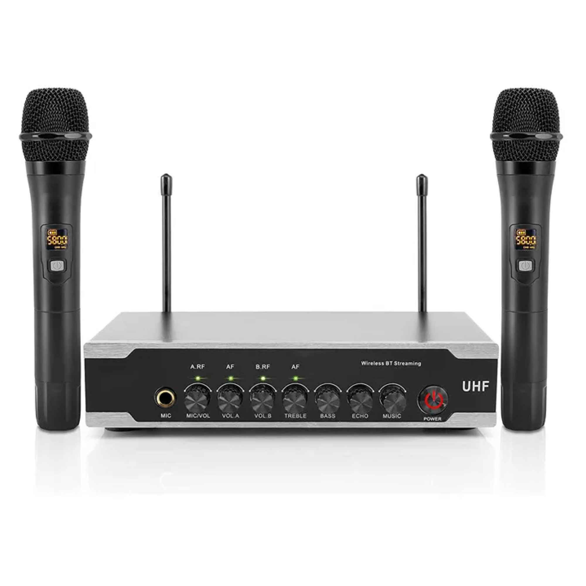 Система оснащена двома бездротовими мікрофонами, кожному з яких можна незалежно регулювати гучність. Забезпечує чітку безшумну бездротову передачу та відмінне відтворення звуку. Просте налаштування та встановлення дозволяють моментально передавати чистий звук. Насолоджуйтесь двоканальним розподілом голосу ручними мікрофонами. Якісна передача звуку, чистий голос та без зворотного зв'язку, без спотворень. Ця бездротова радіосистема UHF призначена для вокалу при живих виступах, звукопідсилення та студійного запису.