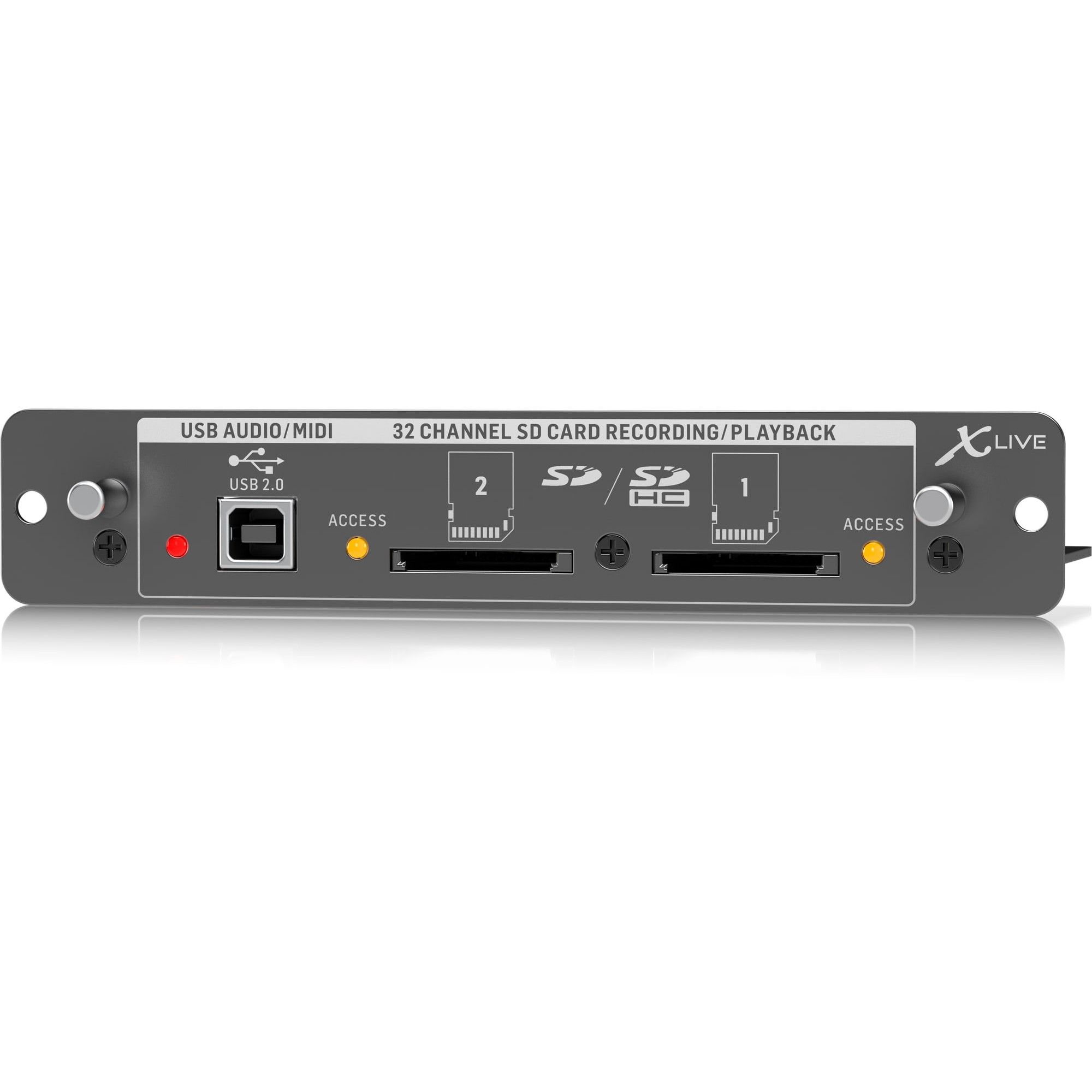 X-Live призначений для розширення можливостей Вашого X32, X-LIVE від Behringer є рекордер/плеєр/USB аудіоінтерфейс, що поєднує в собі можливості USB і MIDI. За допомогою X-LIVE Ви зможете створити 3-годинний запис у форматі WAV. Для оптимального прослуховування/запису файлів за допомогою карт SD/SDHC використовується 32-бітний формат PCM. При необхідності, записи можуть бути безпосередньо імпортовані в популярні звукові редактори для подальшої обробки.