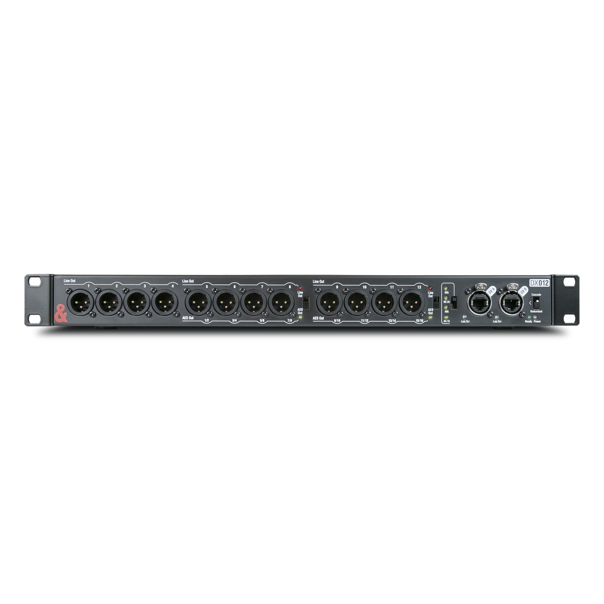 DX012 ідеально підходить для живлення систем моніторингу та підсилювачів, пропонуючи аналогові та цифрові виходи в компактному форм-факторі 1U. Його можна розмістити на відстані до 100 м від міксера, щоб забезпечити максимальну гнучкість розташування, і має вбудовані вушка для монтажу в 1U простір стійки 19". DX012 підключається за допомогою одного кабелю Cat5e до мікшера або розширювача DX за допомогою порту EtherCon. Додатковий порт EtherCon передбачений для резервного підключення до сумісного обладнання або для послідовного підключення до нижнього розширювача DX для додаткового введення/виведення.