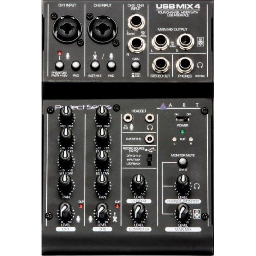 Аудіоінтерфейс ART USBMix4 має високу продуктивність та низький рівень шуму. Мікшер має два мікрофонних входи через комбіновані XLR / 1/4” TRS роз’єми. Перший канал має перемикач для фантомного живлення + 48 В. Другий вхід має перемикач Hi-Z для запису електро-гітар та інших інструментів. Для першого та другого каналів наявні регулювання рівня гучності, підсилення, панорами, а також 2-смуговий еквалайзер для коригування низьких та високих частот. Канал 3 та 4 мають входи через роз’єми 1/4” TRS та регулювання рівня гучності.