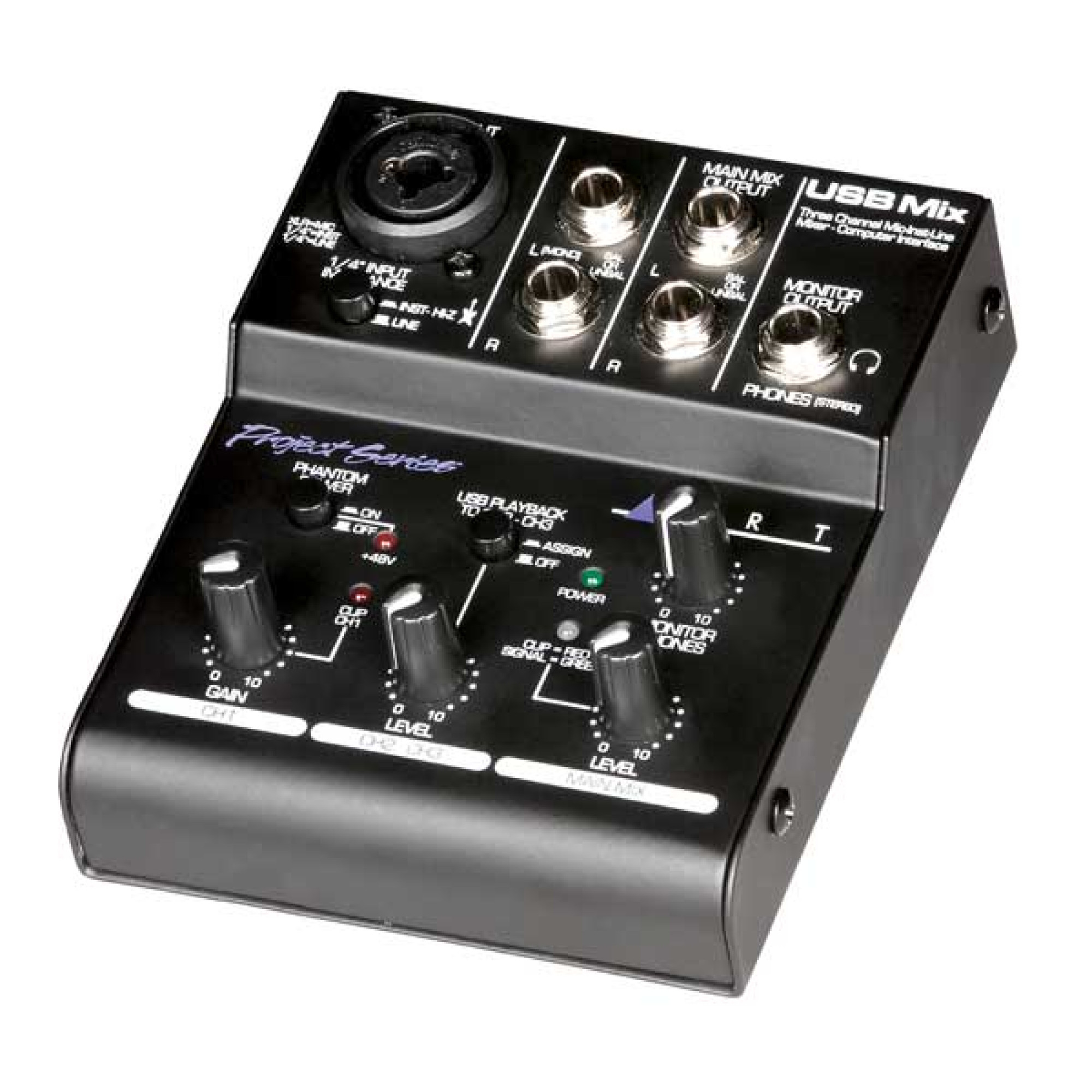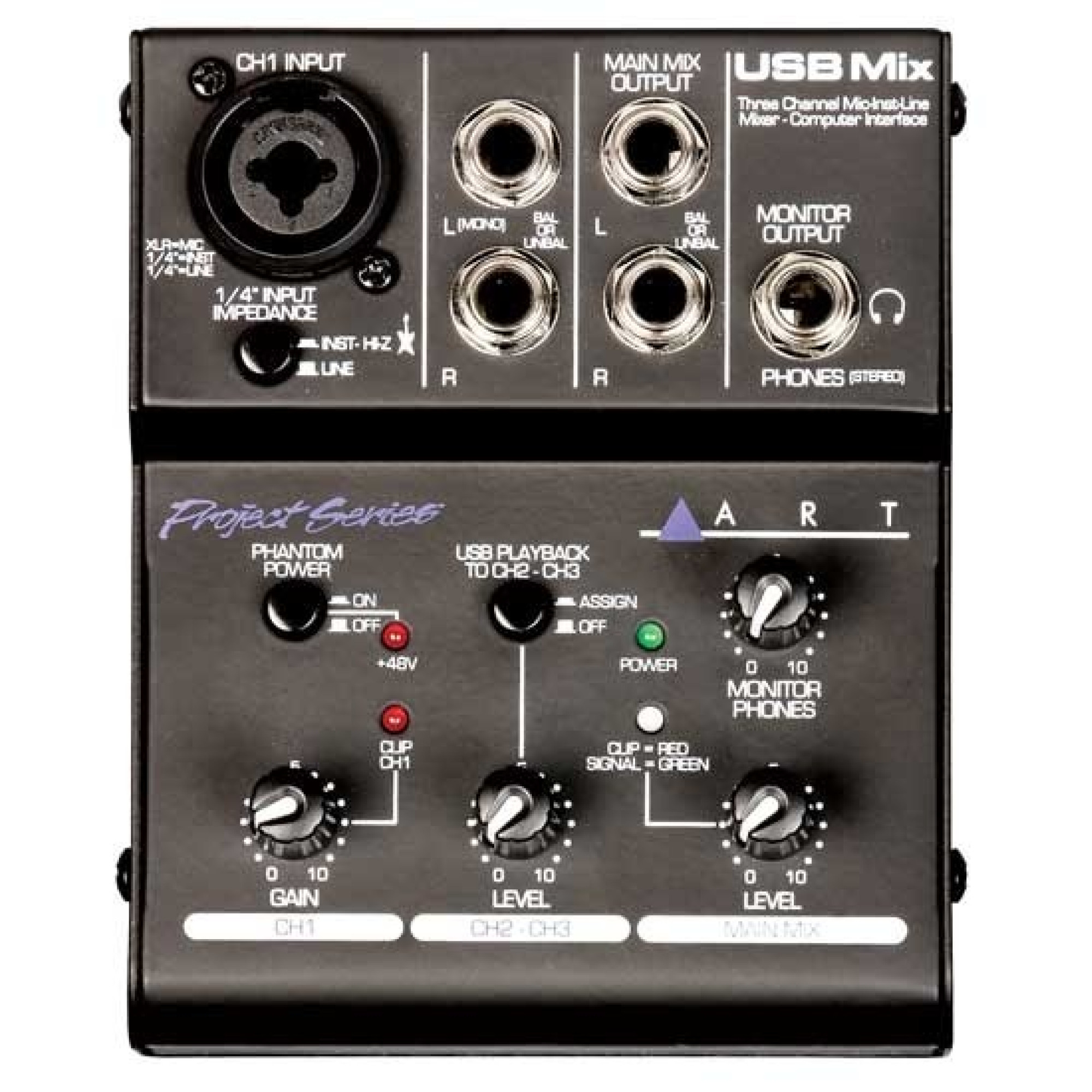 ART USB Mix - це компактний та універсальний 3-канальний мікшер для комп'ютера. Він може бути використаний як самостійний мікшер з використанням адаптера живлення в комплекті.