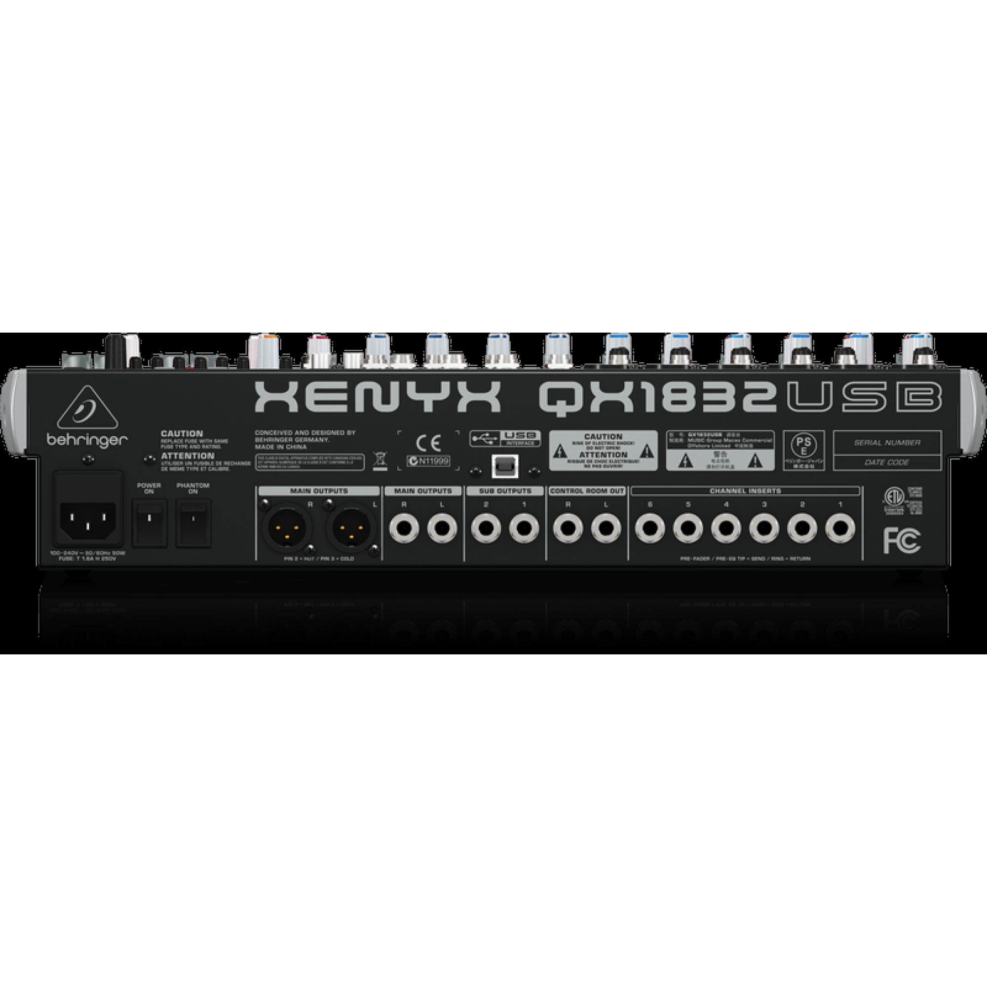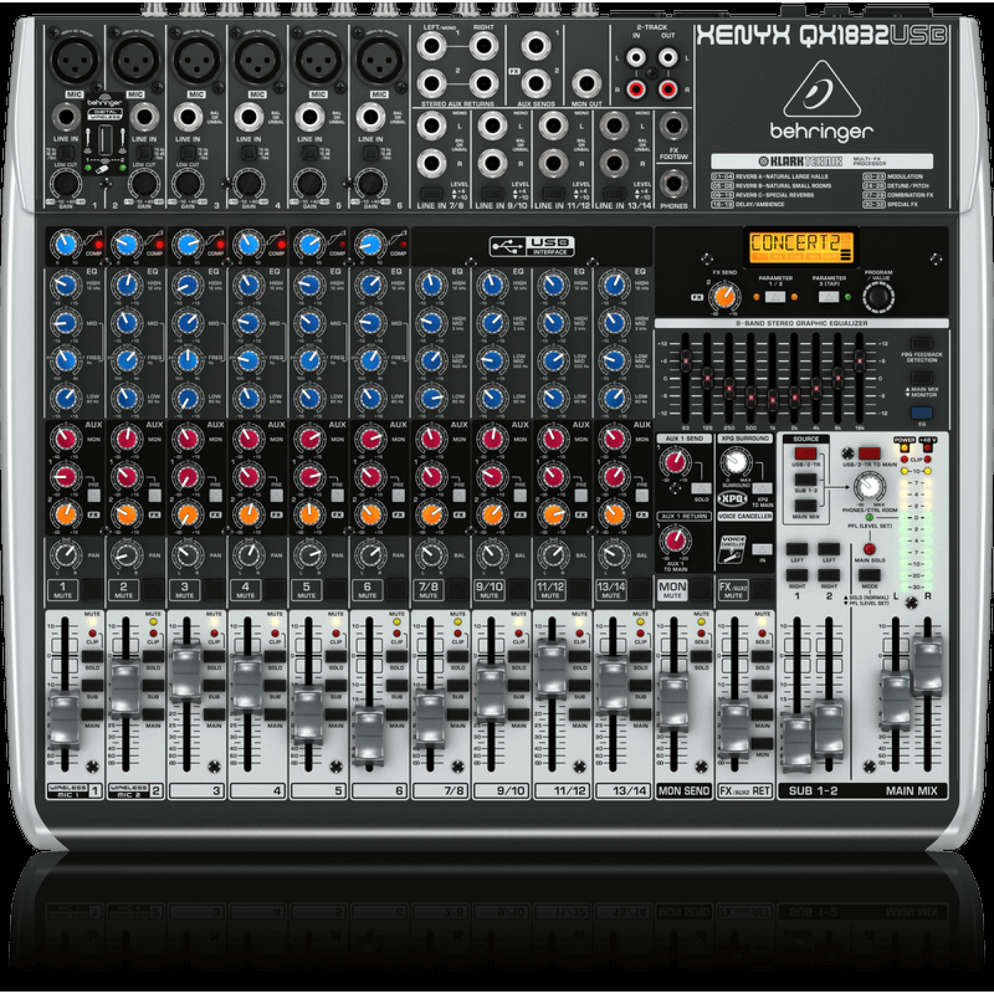 QX1832USB має дві додаткових мікрофонних смуги для шести XENYX мікрофонних передпідсилювачів. Завдяки вбудованому ULM приймача є можливість підключення бездротових мікрофонів. Вбудований 9-смуговий графічний еквалайзер надає розкішну систему еквалайзерів і працює разом з FBQ зворотним зв'язком для виявлення та усунення вереску мікрофона. Іншими характеристиками є повнорозмірні фейдери для Mon та FX посилу і додатковий Aux посилання для загальних трьох і двох адрессуемых підгруп.