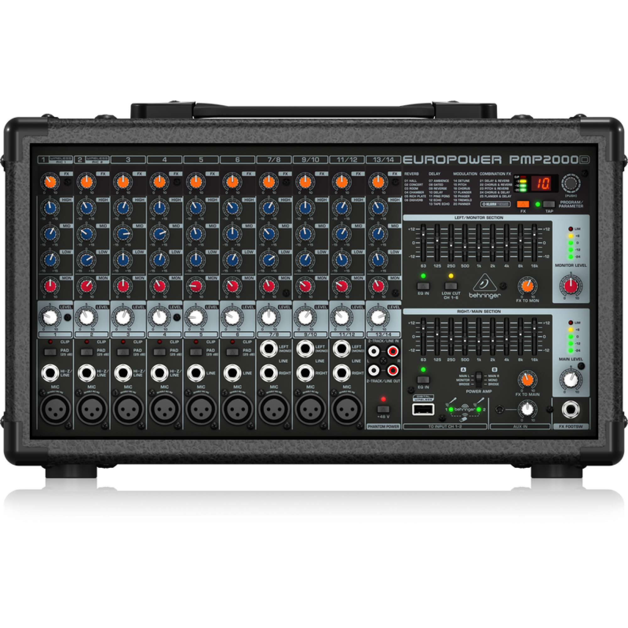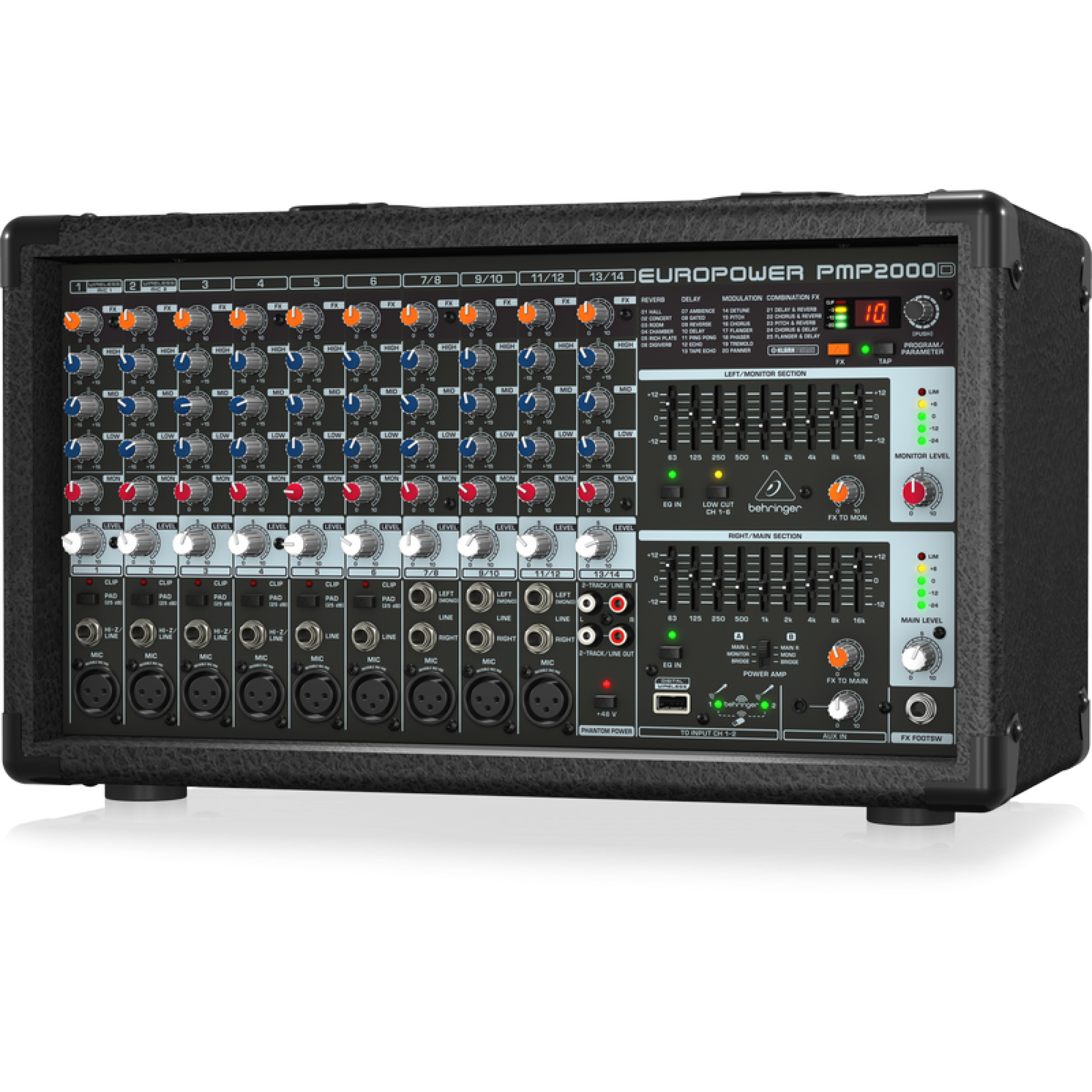 Behringer EUROPOWER PMP2000D - компактний 14-канальний мікшер з вбудованим підсилювачем потужністю 2000 Вт. Завдяки революційній технології підсилювачів класу D компанія Behringer може надати Вам величезну потужність і неймовірні звукові характеристики в зручному, ультрапортативному і легкому корпусі. Зусилля класу D робить все можливе, забезпечуючи максимальну енергоефективність - і усуваючи необхідність в потужних джерелах живлення.