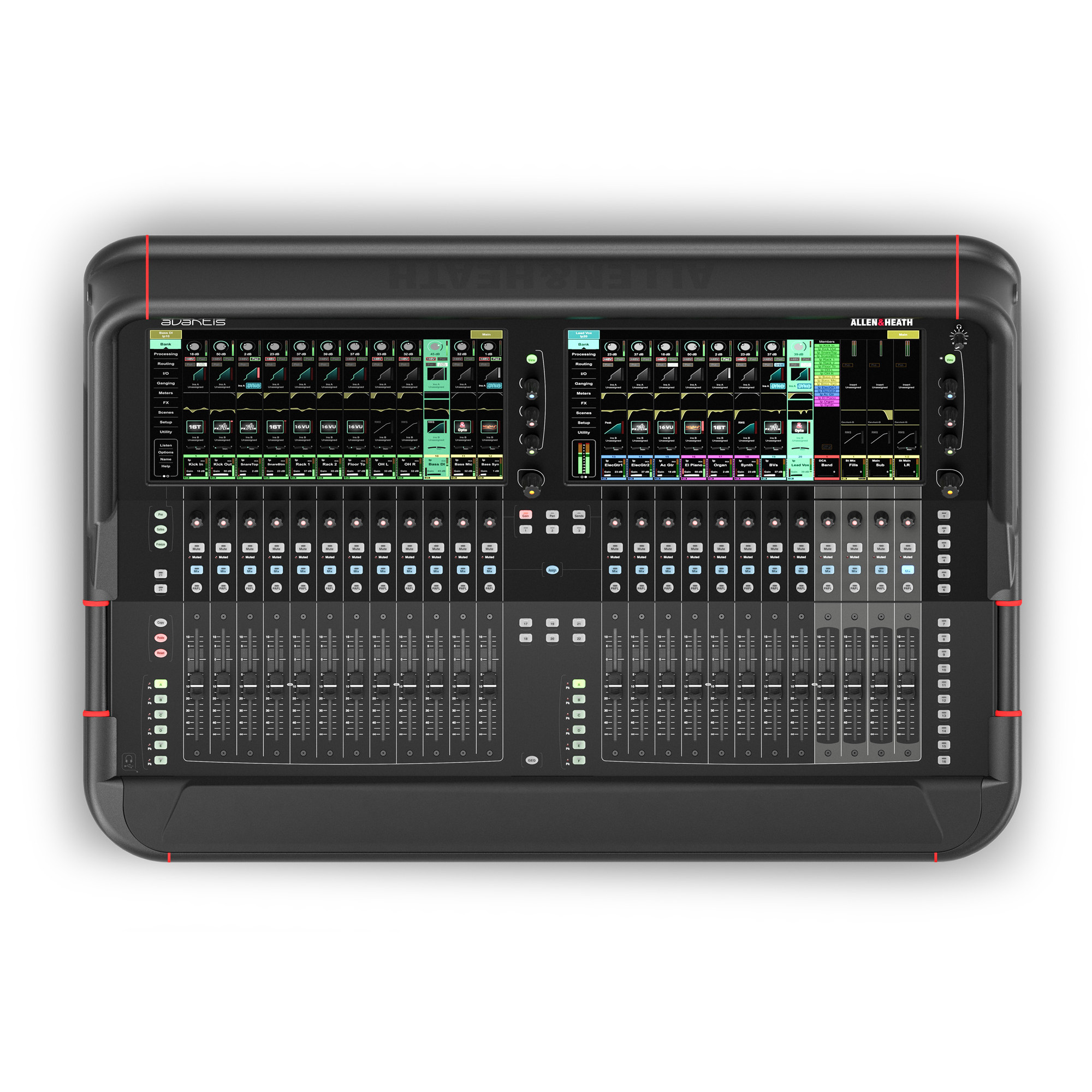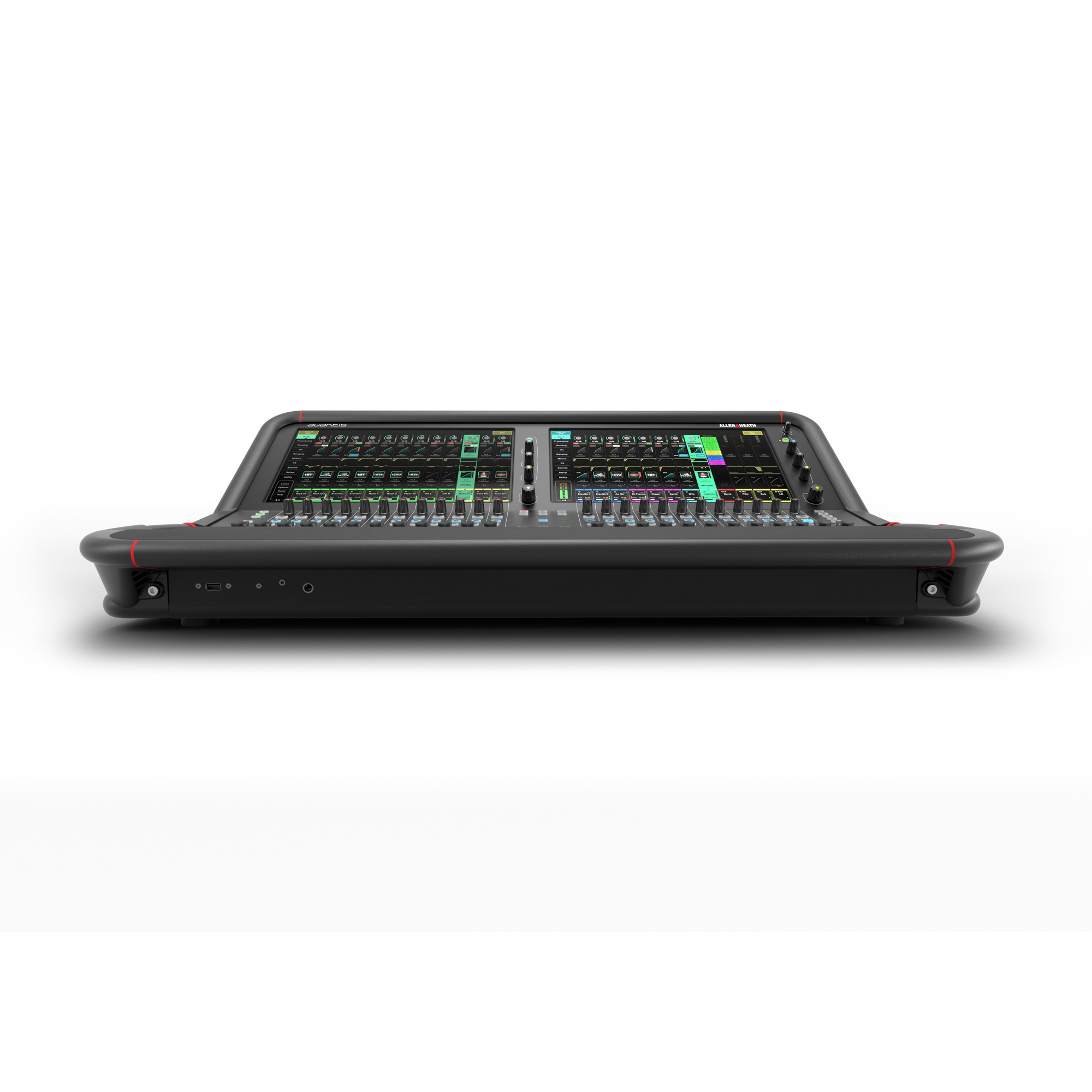 Для доступу до перегляду блоків з іменами каналів, ефектів, введення / виведення, керування сценаріями, налаштувань, утиліт та діагностики передбачено два сенсорних екрани розміром 15.6” Full-HD (1080p). Блоки з іменами каналів відображають інформацію про кожний видимий канал, таку як назва, колір, тип, номер, статус, панорама, затримка, вимірювання та інші параметри. Натискання на ім’я каналу вибере даний канал. Одночасно можна вибрати 2 канали, по одному на кожному сенсорному екрані.