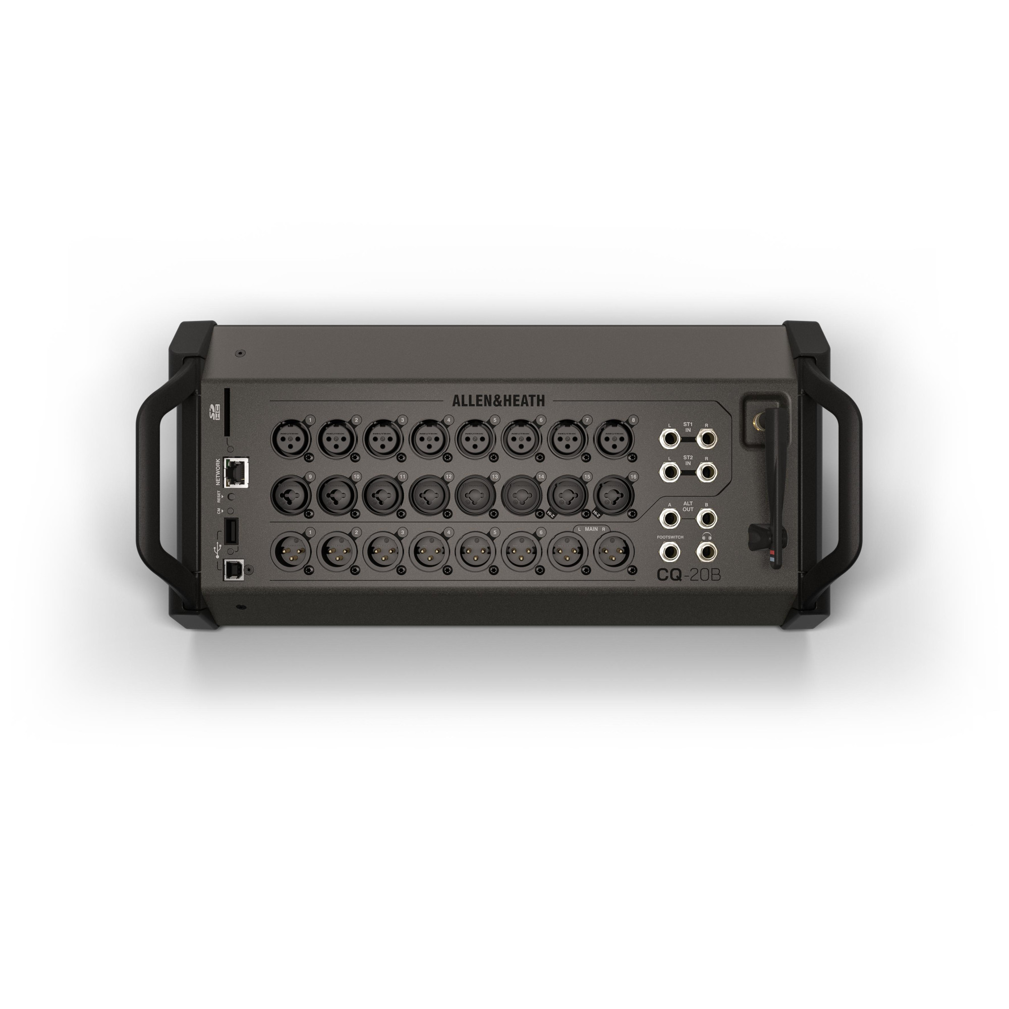 Дизайн даного мікшера вражає, адже в таких компактних розмірах вдалося розмістити велику кількість входів та виходів. CQ-20B має 8 входів на роз’ємах XLR, ще 8 на комбінованих роз’ємах XLR - TRS 1/4", а також 2 стерео входи на 4 роз’ємах TRS 1/4". Така кількість входів дозволяє одночасно записувати велику кількість інструментів, що корисно при записі групи. На 8 роз’ємах XLR розміщені виходи, два із яких позначені як головні, а 6 є додатковими для моніторингу. Ліворуч розміщені роз’єми SD, EtherCON, USB Type A та USB Type B. Дві ручки на корпусі полегшують переміщення мікшера, а додаткове кріплення дохволяє встановити мікшер в рек (кріплення продається окремо).