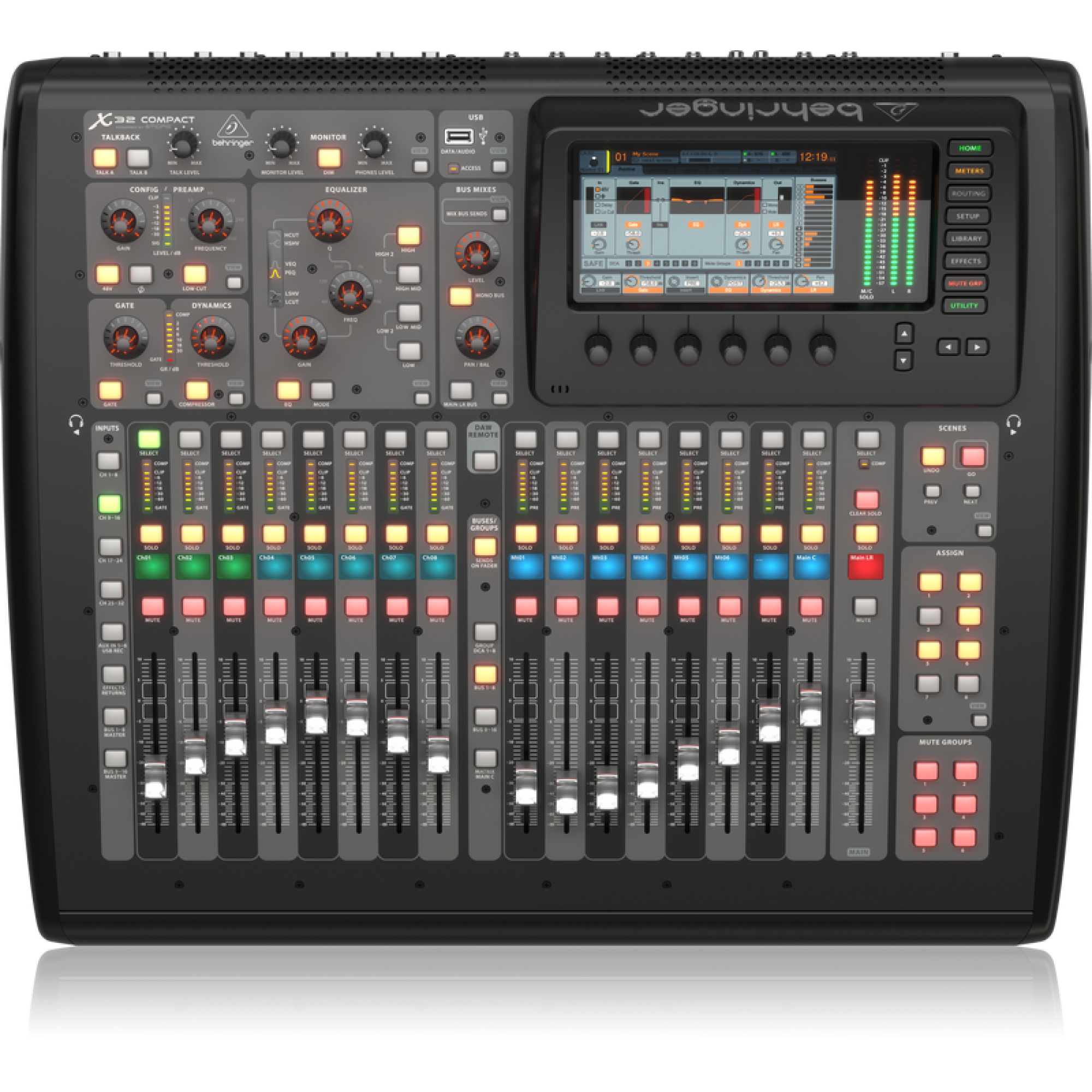 Інженерне рішення каналів X32 Compact встановлює найважливіші параметри обробки каналів в одну секцію, так що незалежно від того, на якому каналі ви працюєте, елементи керування завжди однакові. Цей високоефективне розташування випливає з десятиліть дизайну консолей Behringer та вхідних даних наших користувачів. Оптимізована контрольна підсвітка забезпечує чітку індикацію рівнів або стану з будь-якого кута огляду.