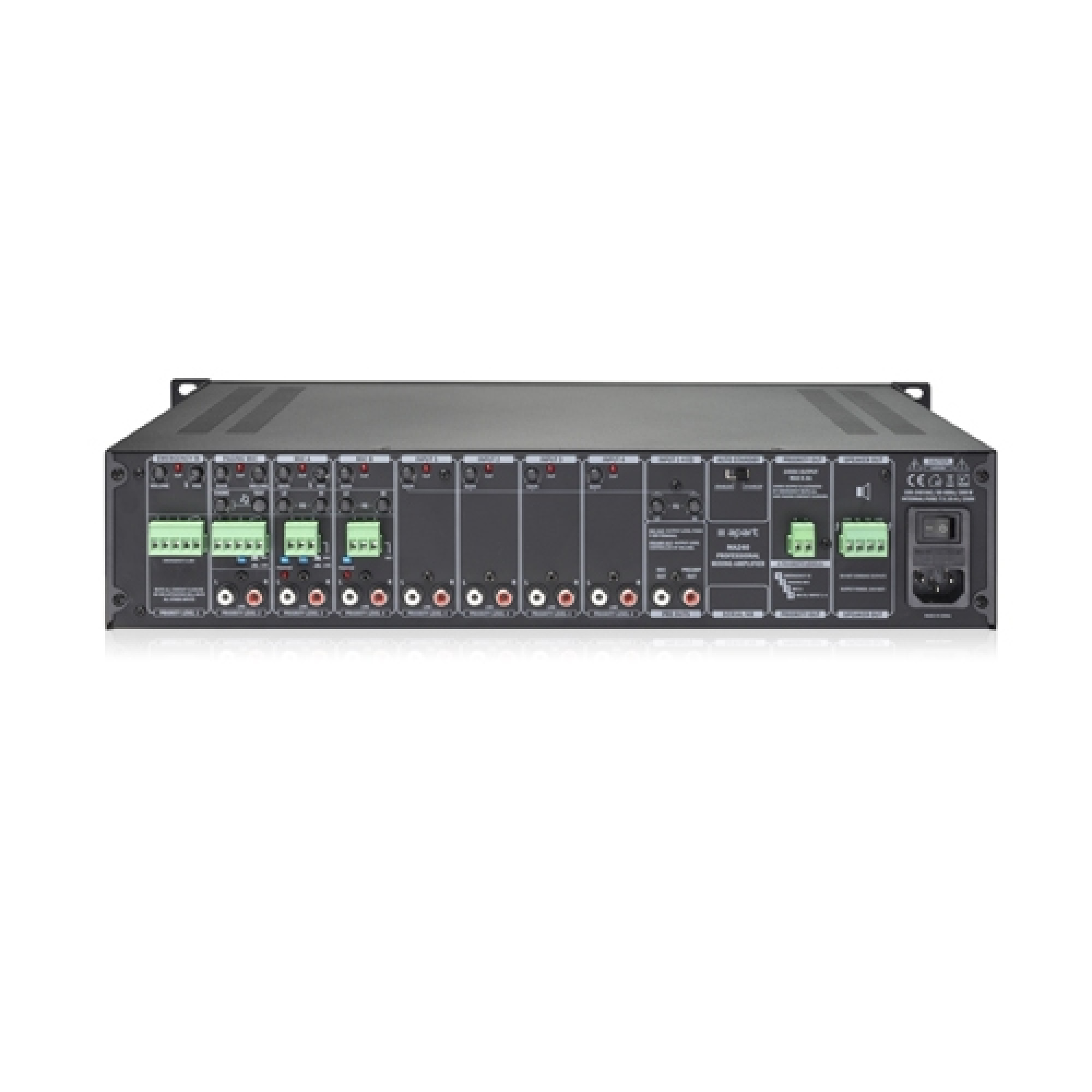 Мікшуючий підсилювач Apart MA240 виконаний в новому інноваційному дизайні та неймовірно простий у використанні. Призначений для роботи в режимі 24/7. Робоча потужність Apart MA240 в трансформаторному режимі 240 Вт 100 В/70 В, в низькоомному режимі 240 Вт/4 Ом. Оснащений 2 мікрофонними/лінійними і 4 лінійними стерео входами, які зводяться в моно суму. Нова задня панель, де відбуваються всі підключення до підсилювача, не викликає ніяких питань, все логічно, зрозуміло, кожне налаштування і роз'єм підписані і промарковані.