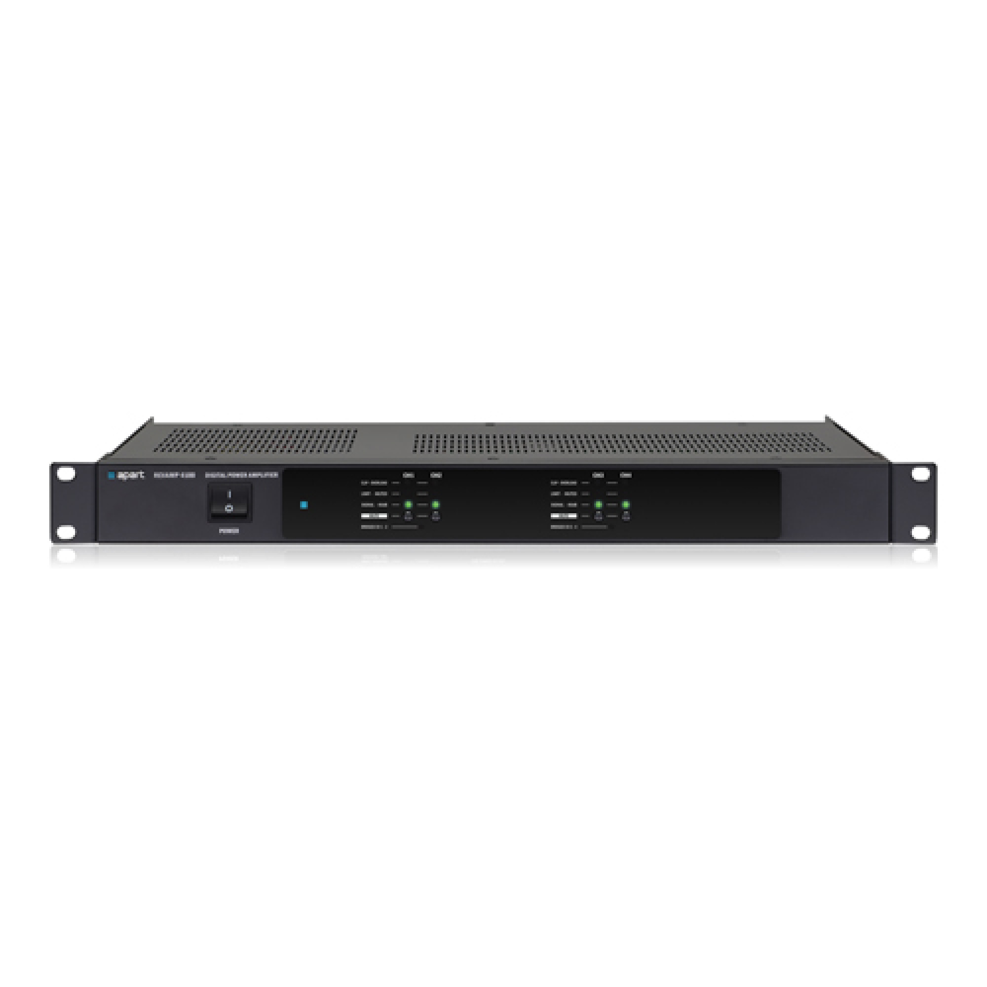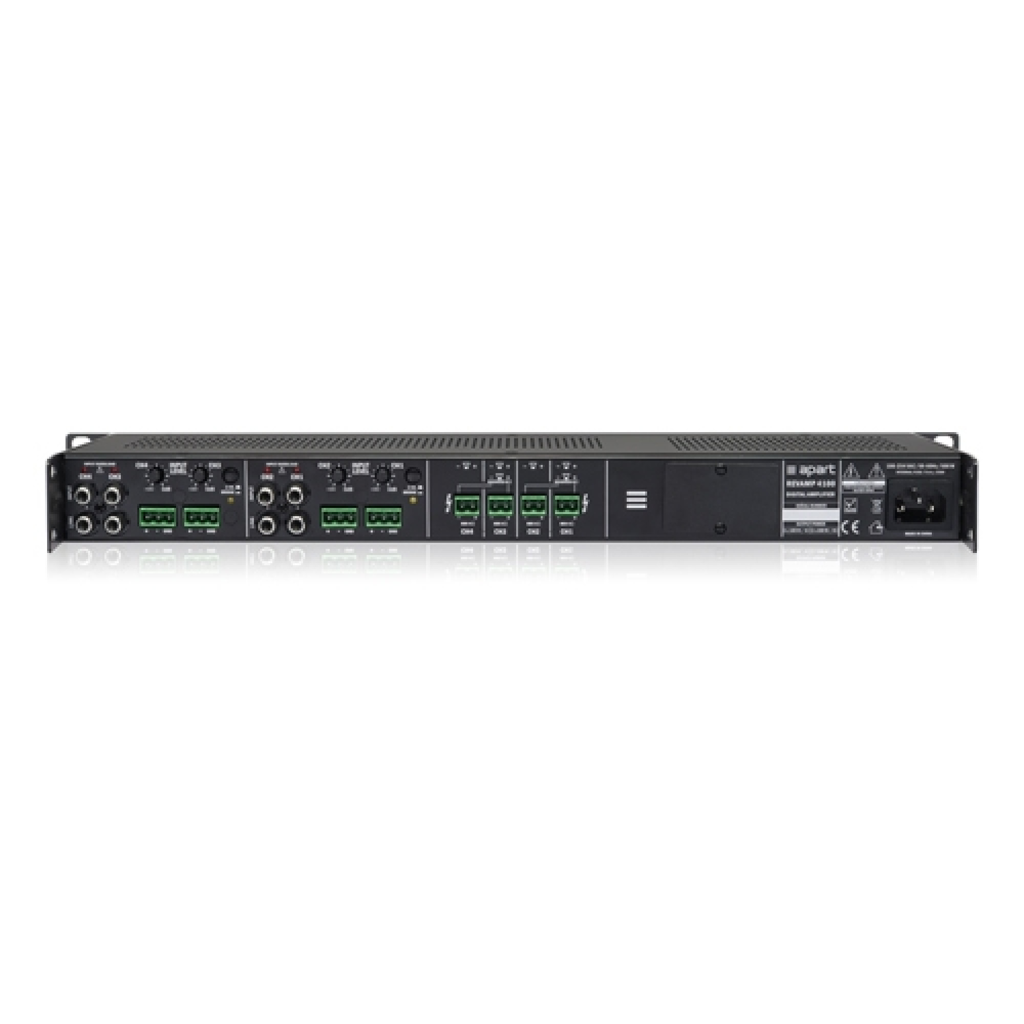 REVAMP4100 - професійний 4-канальний цифровий підсилювач, що забезпечує вихідну потужність 100 Вт кожного канала при навантаженні 4 Ом. В мостовому режимі підсилювач розвиває потужність 225 Вт на 2 каналах. Високоефективний блок живлення і схемотехніка класу D - дають малі габарити і вагу. Система охолодження - конвекційна. Канали підсилювача можна використовувати для озвучування 4 моно зон, 2 стерео зони, в мостовому режимі - 2 моно зони, 1 стерео. 4 несиметричних лінійних входи RCA, 4 симетричних входи євроблока. 4 Перемикачі режимів стерео/мостовий - на задній панелі підсилювача. У комплекті поставки - кріплення для установки в апаратний шафа або рекову стійку розміром 19".