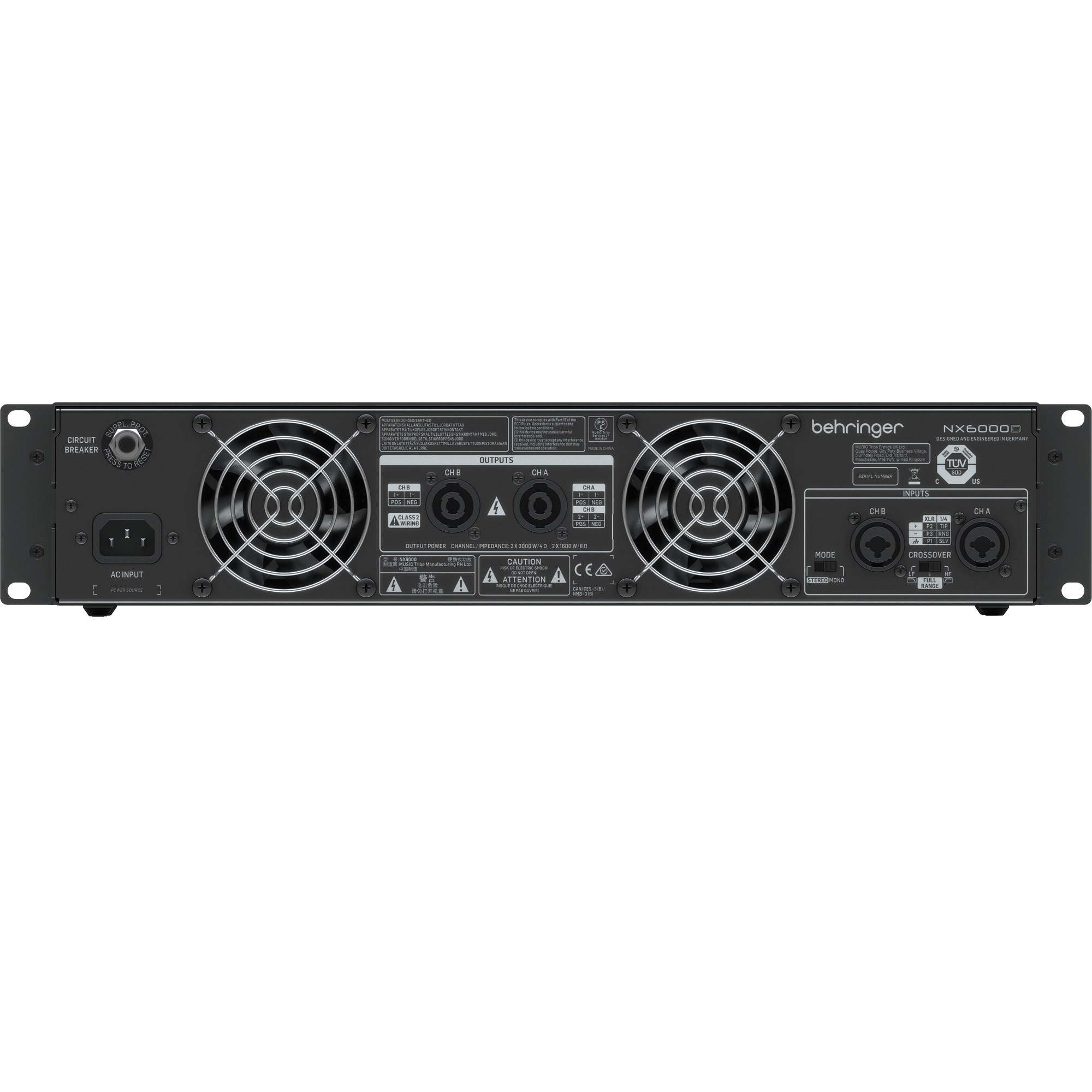 Behringer NX6000 – 6000-ватний підсилювач потужності (2 х 3000 Вт при 4 Ом, 2 х 1600 Вт при 8 Ом) монтуємий в рек, максимально надійний, завдяки революційній "cool" технології високої щільності класу D (cool-running High-Density Class -D technology) з "майже нульовим" тепловим накопиченням. NX6000 також характеризується лімітерами "Zero-Attack", які забезпечують максимальний вихідний рівень з виключно надійним захистом від перевантаження і технологією компенсації імпедансу динаміка SmartSense, що забезпечує повністю лінійний частотний діапазон при будь-якому імпедансі навантаження динаміка. Революційна технологія high-density класу D в поєднанні з ультра-ефективним джерелом живлення з перемикаємим режимом гарантує, що цей потужний підсилювач буде служити Вам протягом багатьох років.