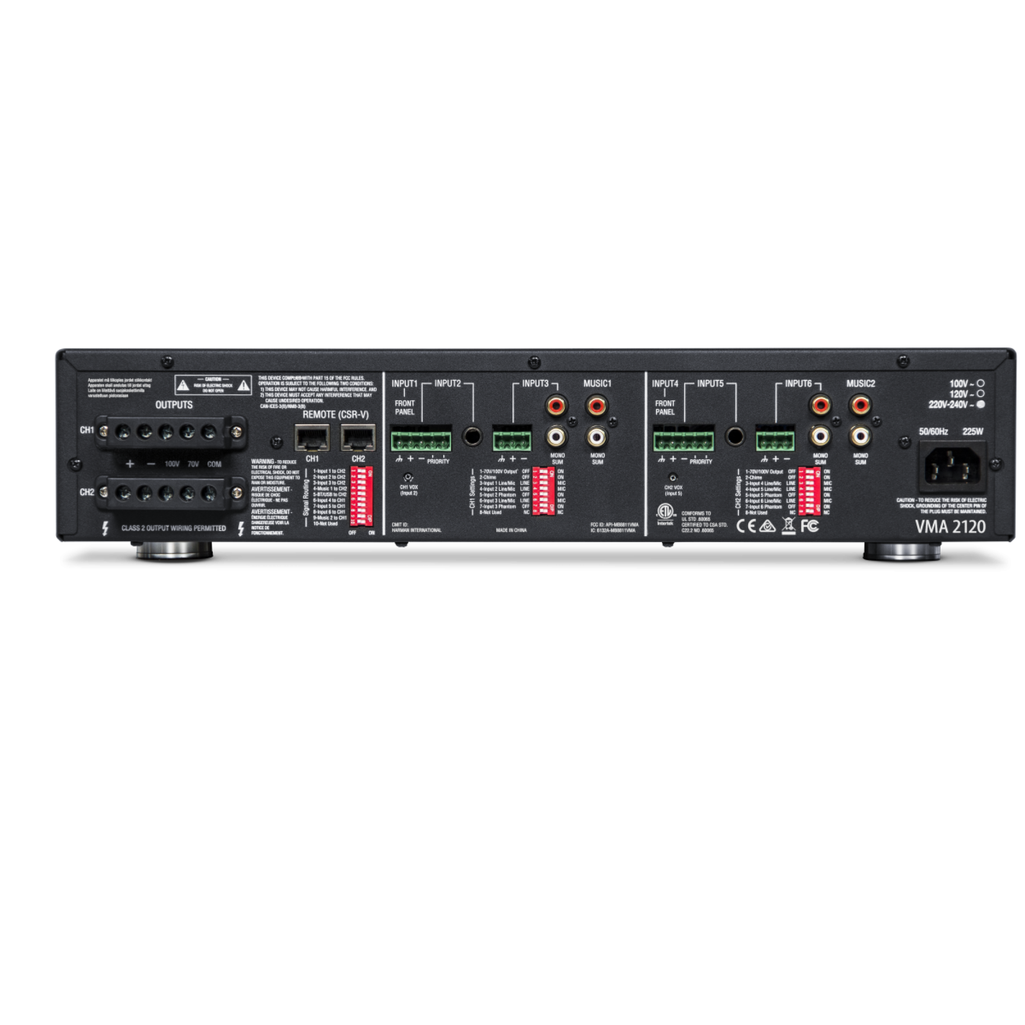 Загальна потужність кожного з каналів становить 120 Вт, що дозволяє ефективно озвучити великі зали, торгові майданчики, ресторани, школи чи конференц-зали. У VMA 2120 доступно 8 вхідних каналів — 6 на задній панелі та 2 на передній — з роз’ємами RCA, ¼" TRS та Euroblock, що забезпечує гнучкість у виборі джерел сигналу. Пристрій має вбудований медіапрогравач з USB-входом і модулем Bluetooth для відтворення MP3-файлів.
