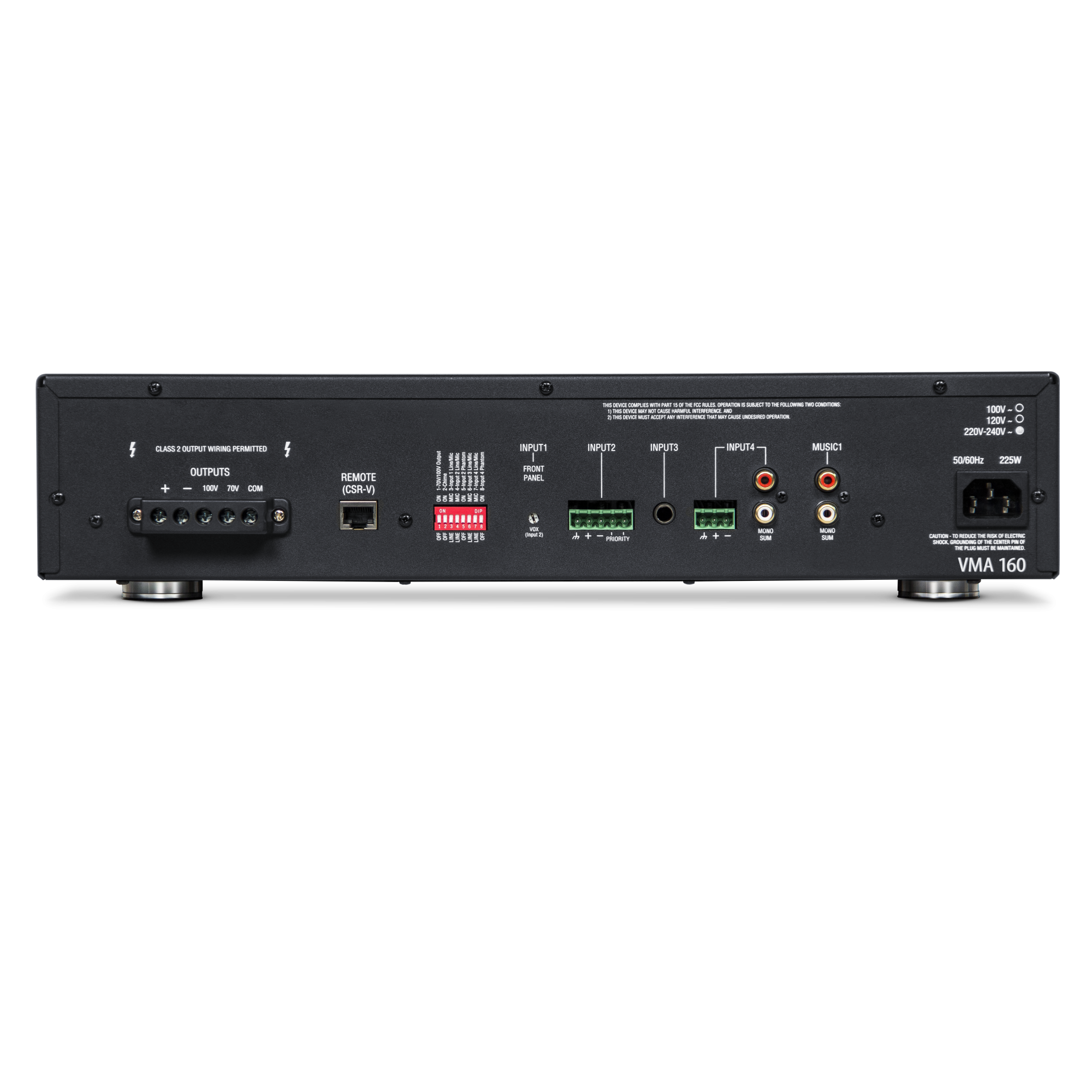 VMA 160 обладнаний п’ятьма входами для підключення різних джерел сигналу: два TRS, один RCA, один Euroblock і один комбінований XLR/TRS, що забезпечує сумісність як із мікрофонними, так і з лінійними сигналами. Кожен вхід має окреме регулювання гучності, що дозволяє точно налаштовувати мікс відповідно до потреб.