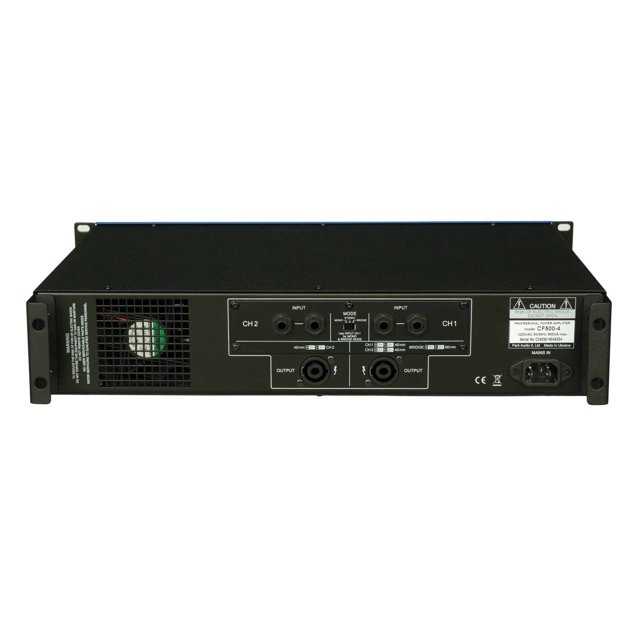 Професійні підсилювачі потужності серії CF призначені для високоякісного посилення сигналів звукової частоти у складі комплексу професійної звукопідсилювальної апаратури. Підсилювач Park Audio CF500-4 виконаний у металевому (сталевому) корпусі висотою 88 мм (2U). Конструкція підсилювача передбачає встановлення його в стандартну стійку (RACK 19"). Конструктивно підсилювач складається з джерела живлення, блоку посилення (обидва канали на одній друкованій платі), вхідного блоку, блоку індикації та регуляторів рівня вхідного сигналу. У моделях CF500-4, CF500-8, CF700-4, CF700-8 встановлюється вхідний блок без кросовера з вхідними з'єднувачами 1/4” JACK (по два включені паралельно для кожного каналу). встановлюється вхідний блок з кросовером та вхідними з'єднувачами XLR.