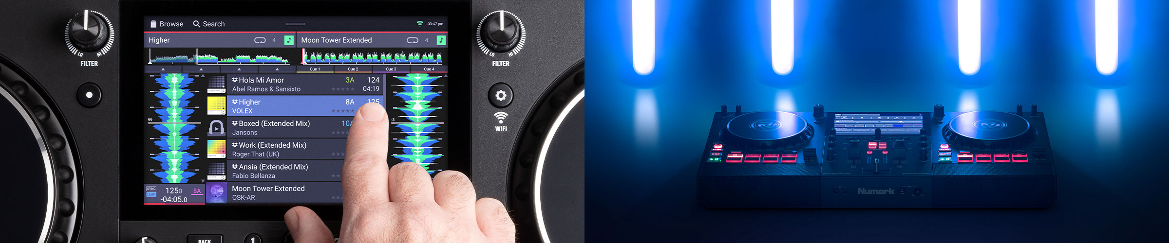 Інтуїтивно зрозуміле компонування та 7-дюймовий сенсорний екран високої чіткості дозволяють діджеям переглядати, завантажувати та відтворювати музику як ніколи раніше. Для створення ідеального мікшування повнофункціональний еквалайзер та секція FX розкривають можливості діджея. Чотири вбудовані ефекти (Echo, Flanger, Delay і Phaser) ідеально відповідають ритму, коли вони включаються за допомогою інтерактивних тумблерів. Ніщо не порівняється за відчуттями з мікшуванням ідеальної композиції в ідеальний час, а великі регулятори Filter додають ще більше азарту, забезпечуючи практичне керування низькими та високими частотами для створення ефектних міксів, сумішей та переходів.