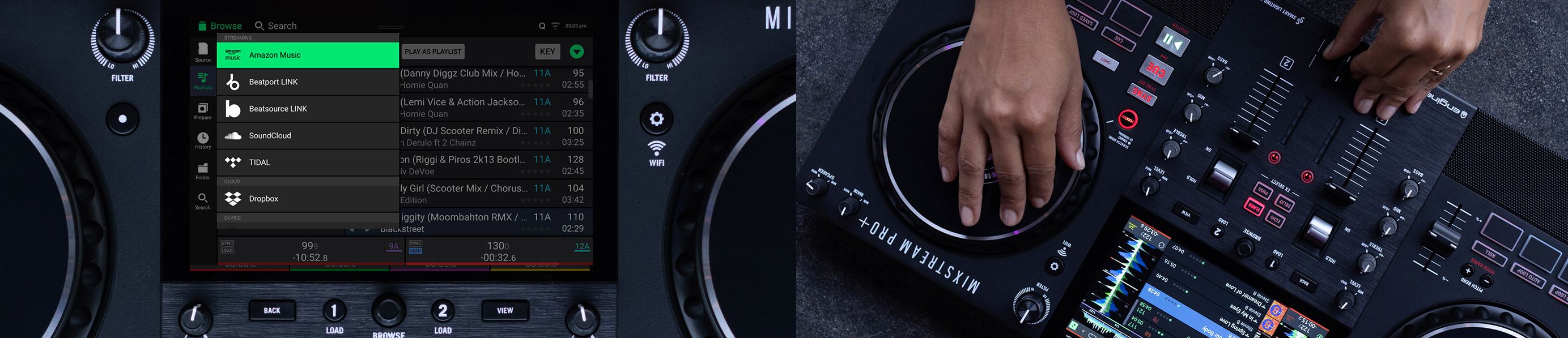 Mixstream Pro+ інтегрується з Amazon Music Unlimited та іншими популярними сервісами потокового мовлення, надаючи миттєвий доступ до більш ніж 100 млн композицій CD-якості (так званих "lossless") у всіх музичних жанрах. Вбудований Wi-Fi та блискавичний вбудований аналіз композицій дозволяють годинами практикуватися та виступати, не маючи власної музики та не готуючи її заздалегідь. Треки аналізуються на предмет частоти обертів за хвилину і тональності в міру їх завантаження та буферизації у внутрішню пам'ять, що забезпечує безперебійне відтворення на будь-якій вечірці, концерті чи живій трансляції.