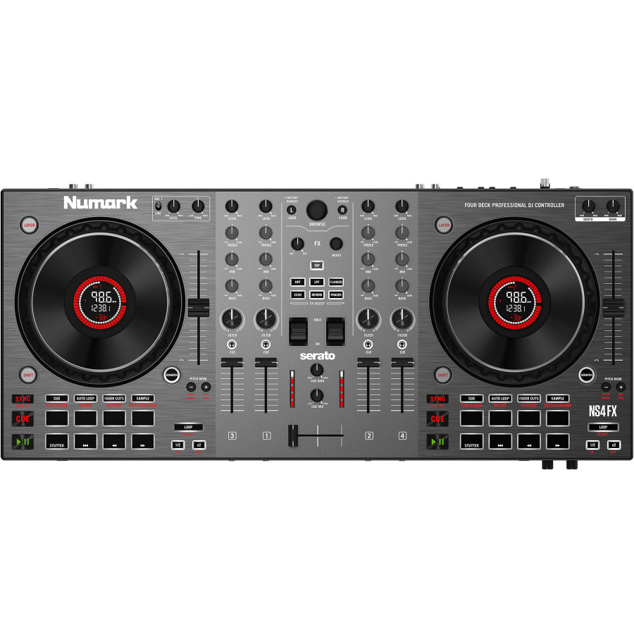 Створена для роботи модель NS4FX відрізняється високоякісними деками, які мають той зовнішній вигляд, функціональність та відчуття, які зробили Numark популярним серед діджеїв у всьому світі. Кожна дека має спеціальні високоякісні фейдери гучності, великі ручки фільтра високих та низьких частот, а також 3-смуговий еквалайзер. Перемикачі призначення кросфейдера на передній панелі дозволяють призначити кожен канал на сторону A або B чи повністю обійти кросфейдер. Ширина Numark NS4FX складає близько 600 міліметрів, а вага – 3 кг. Така мала вага пояснюється тим, що в його конструкції переважає пластик. Контролер має сіру обробку, світлішу, ніж типовий чорний колір контролерів.