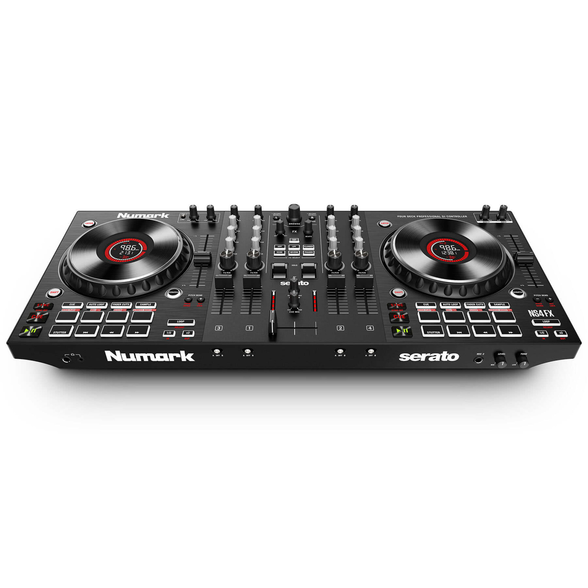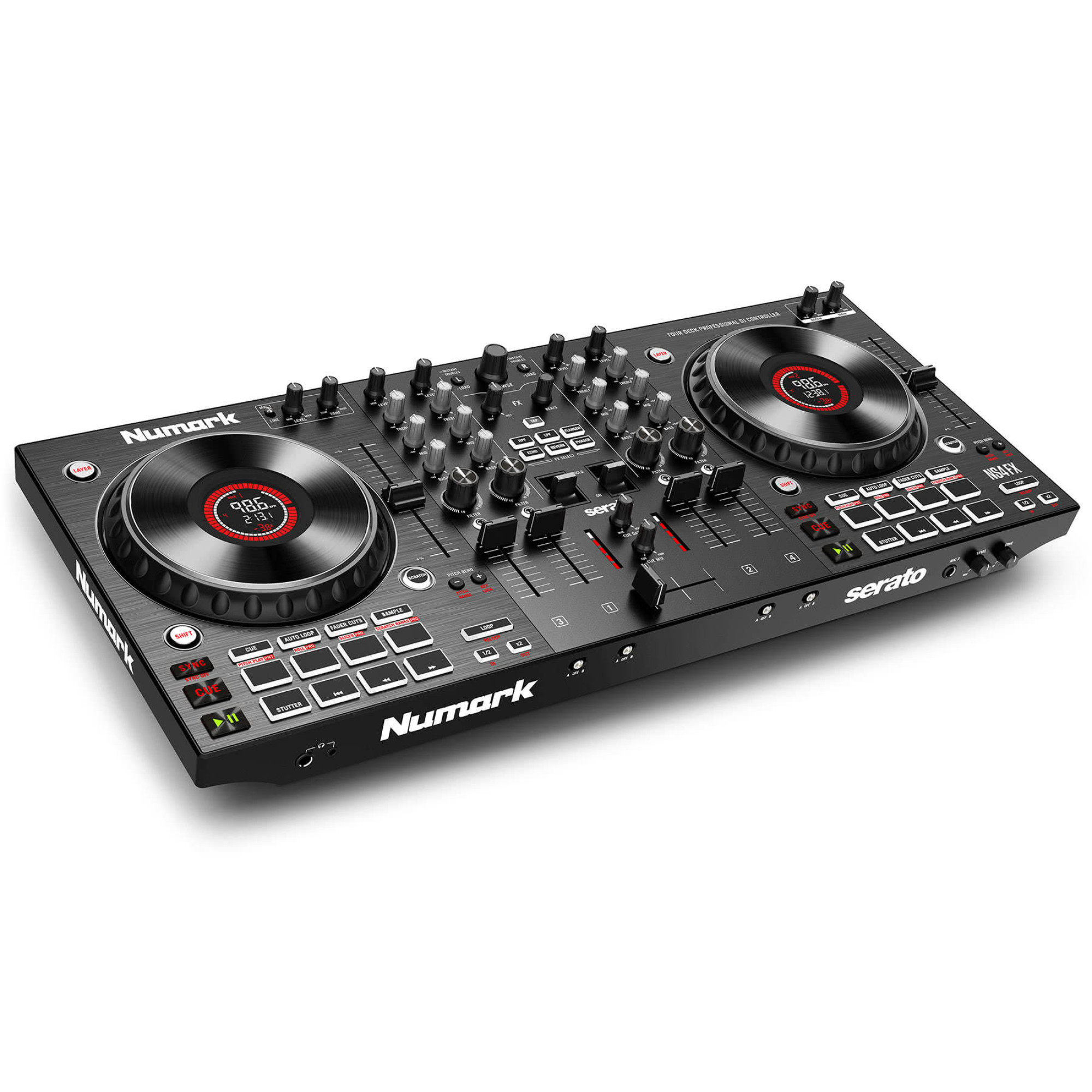 NS4FX оснащений усіма функціями професійного діджея, що необхідні для виняткових виступів. Високоякісні сенсорні джог-колеса відкалібровані для точного мікшування та скретчингу. На 6-дюймових сенсорних джог-колесах з ємнісним керуванням розташовані дисплеї, на яких відображається інформація про положення доріжки, BPM, діапазон тональності та час. Під кожним джог-колесом розташовано по вісім педів. 16 педів Performance з можливістю вибору таких режимів як Cue, Auto Loop, Fader Cuts і Sampler забезпечують NS4FX широкі можливості для будь-якого робочого процесу. Поруч із педами розташовані регулятори лупів. Є фізичні кнопки для зміни висоти тону, блокування клавіш та керування діапазоном темпу повзунка висоти тону. Кнопка шару на кожній деці дозволяє перемикатися між декількома деками, що дає можливість діджею накладати та мікшувати до чотирьох треків одночасно. Ще один приємний штрих на кожній деці – довгий пітч-слайдер з можливістю вибору діапазону, що забезпечує надточний контроль темпу при мікшуванні.