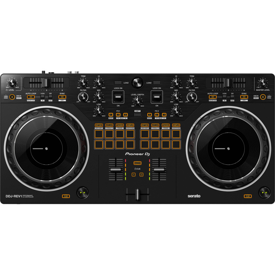 Почати роботу з діджейським пультом простіше простого, якщо під рукою є контролер Pioneer DDJ-REV1. Цей дводековий DJ-контролер професійної якості легко взаємодіє із програмами Serato DJ Lite та DJ Pro. Він оснащений парою збільшених джог-колес. 16 педів (по 8 на деку) забезпечують функції Hot Cue, Auto Loop, Tracking та Sampler, а також режими Beat Jump, Roll, Trans та Scratch Bank. На центральній панелі DDJ-REV1 розташований 2-канальний мікшер із вбудованою звуковою картою. Кожен канал має тример, 3-смуговий еквалайзер, двосмуговий фільтр Sound Color (HP/LP) та фейдер рівня. Beat FX можна запускати за допомогою важелів ефектів, які дозволяють вмикати та вимикати ефекти на мить або фіксувати їхнє положення. Контролер також може керувати 3-ьою та 4-ою деками за допомогою програми Serato DJ. Вперше в DJ-контролерах Pioneer такого рівня вихід майстер-звуку інтегрується зі звуком мікрофона, що усуває необхідність зовнішнього обладнання, такого як звукова карта або окремий мікшер. Всі звуки передаються Serato DJ, і Ви можете вести звідти потокове мовлення. Pioneer DDJ-REV1 працює від шини та постачається з USB-кабелем.