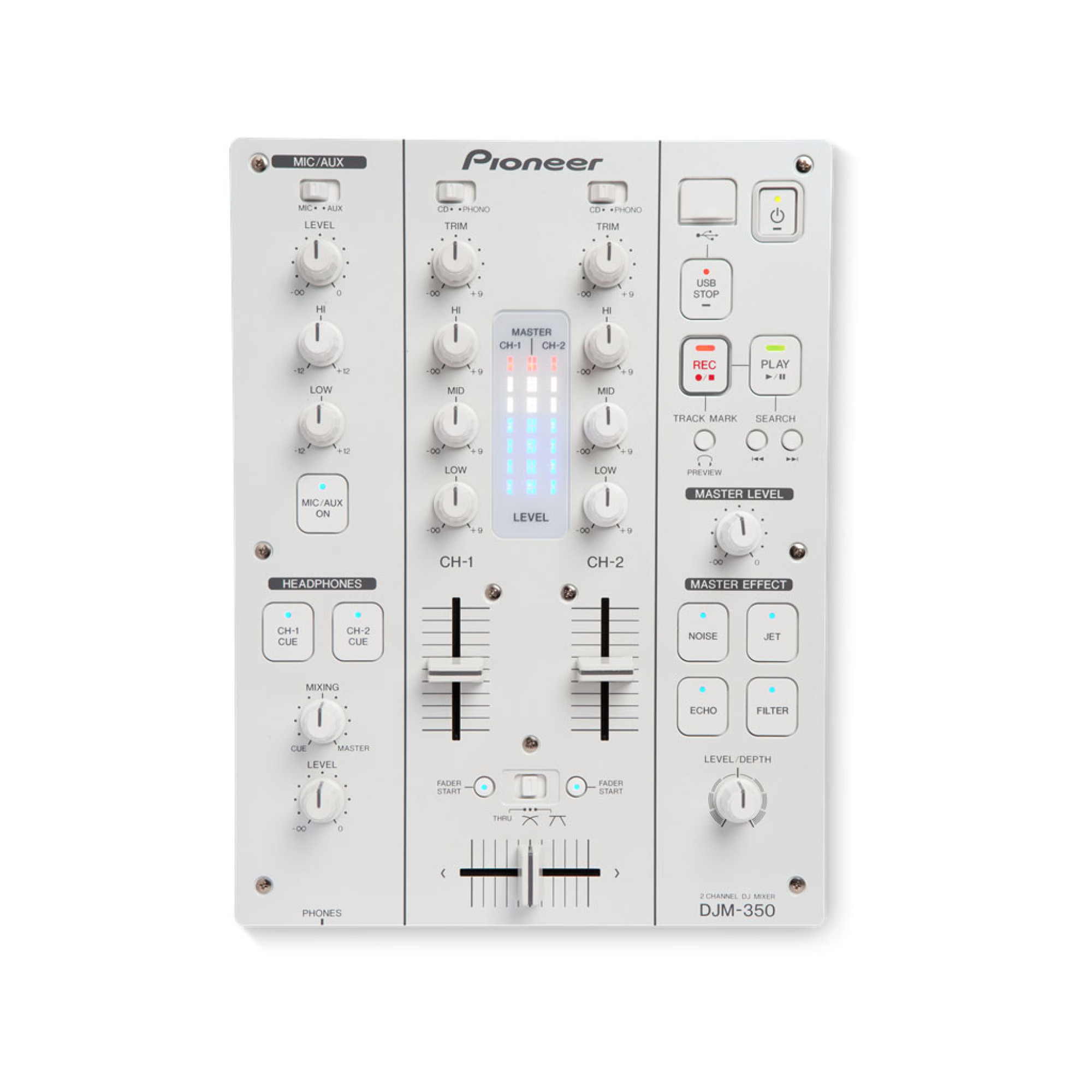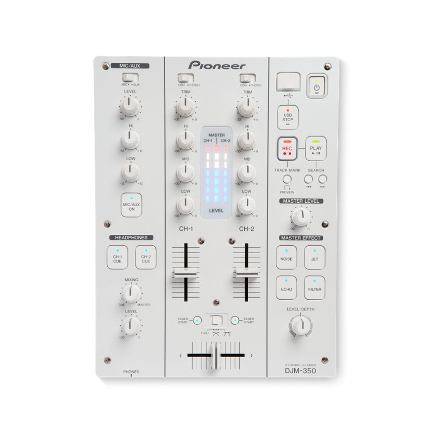 DJM-350 володіє тими ж функціями як і решта DJM лінійка Pioneer. Мікшер укомплектований ефектором, 3х смуговим еквалайзером і USB портом дозволяє записувати мікс на USB носії для подальшого прослуховування на сторонніх пристроях. Directly Record to USB Devices - Прямий запис на USB носії. Дозволяє записувати лайв-мікси на ЮСБ носії через порт (Тип А), розташованому на лицьовій панелі пульта і не вимагає додаткового програмного забезпечення. Записані мікси зберігаються в форматі WAV і можуть бути імпортовані на PC / MAC або відтворені на портативних плеєрах. Еффектор включає в себе: "Filter, Crush, Jet, Gate" і 3х смуговий еквалайзер працює в діапозоні від + 9dB до -∞ (cut). Колір: DJM-350-W (білий), DJM-350 (чорний).
