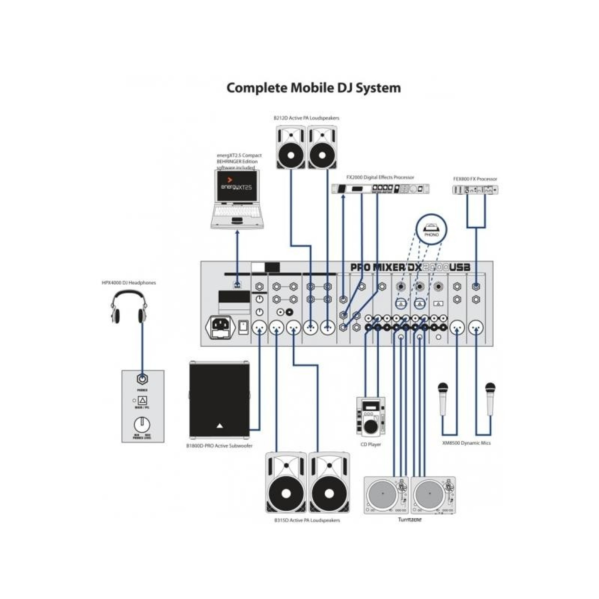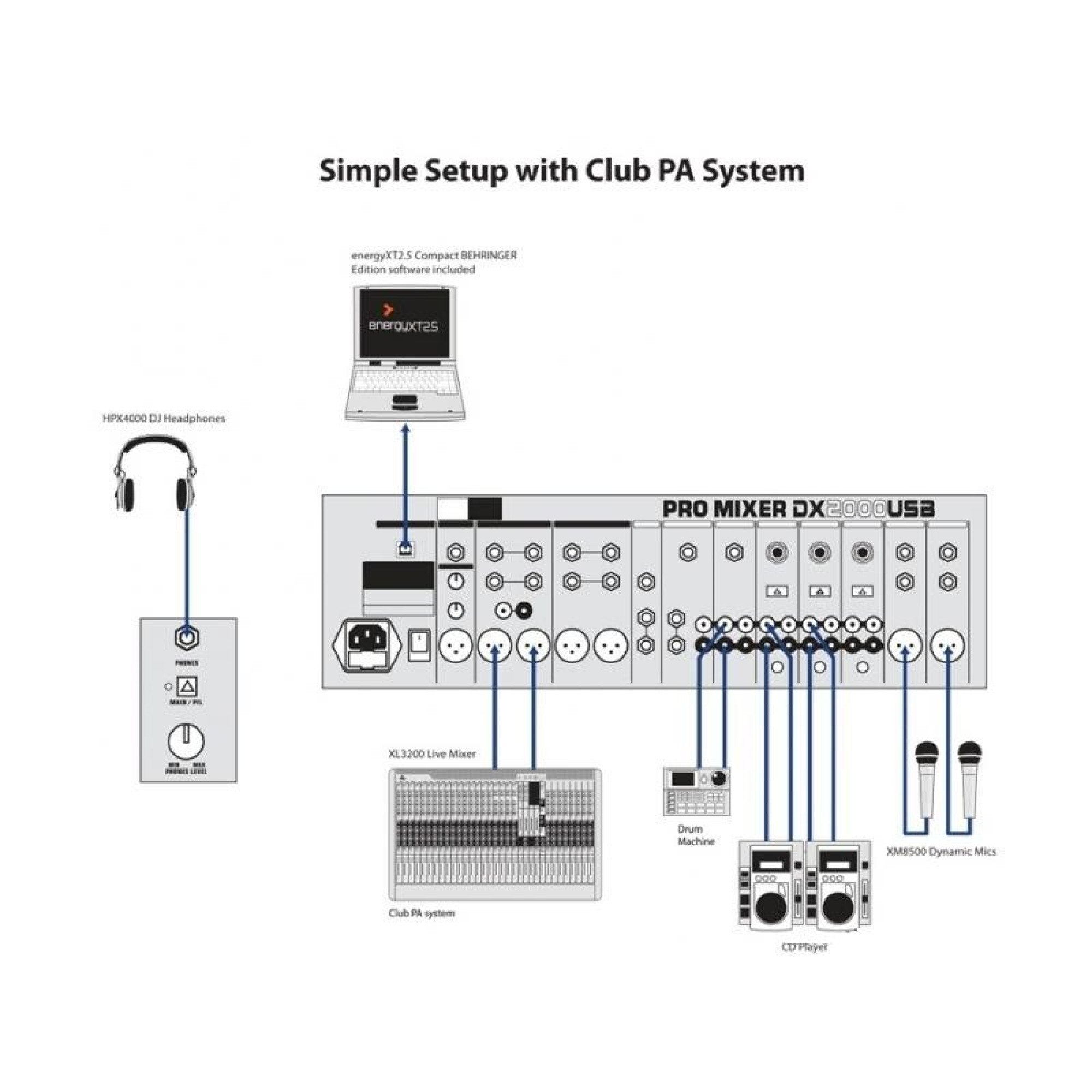 Мікшер має 5 подвійних стереовходів плюс 2 моно мікрофонні/лінійні канали з якісними мікрофонними попередніми підсилювачами, фантомним живленням, регулятором посилення та світлодіодним індикатором кліпу. DX2000USB також має достатню кількість вбудованих фонопідсилювачів для роботи до 3 програвачів. Вбудований USB/аудіоінтерфейс дає можливість додати до міксу цифрову музичну бібліотеку комп’ютера.