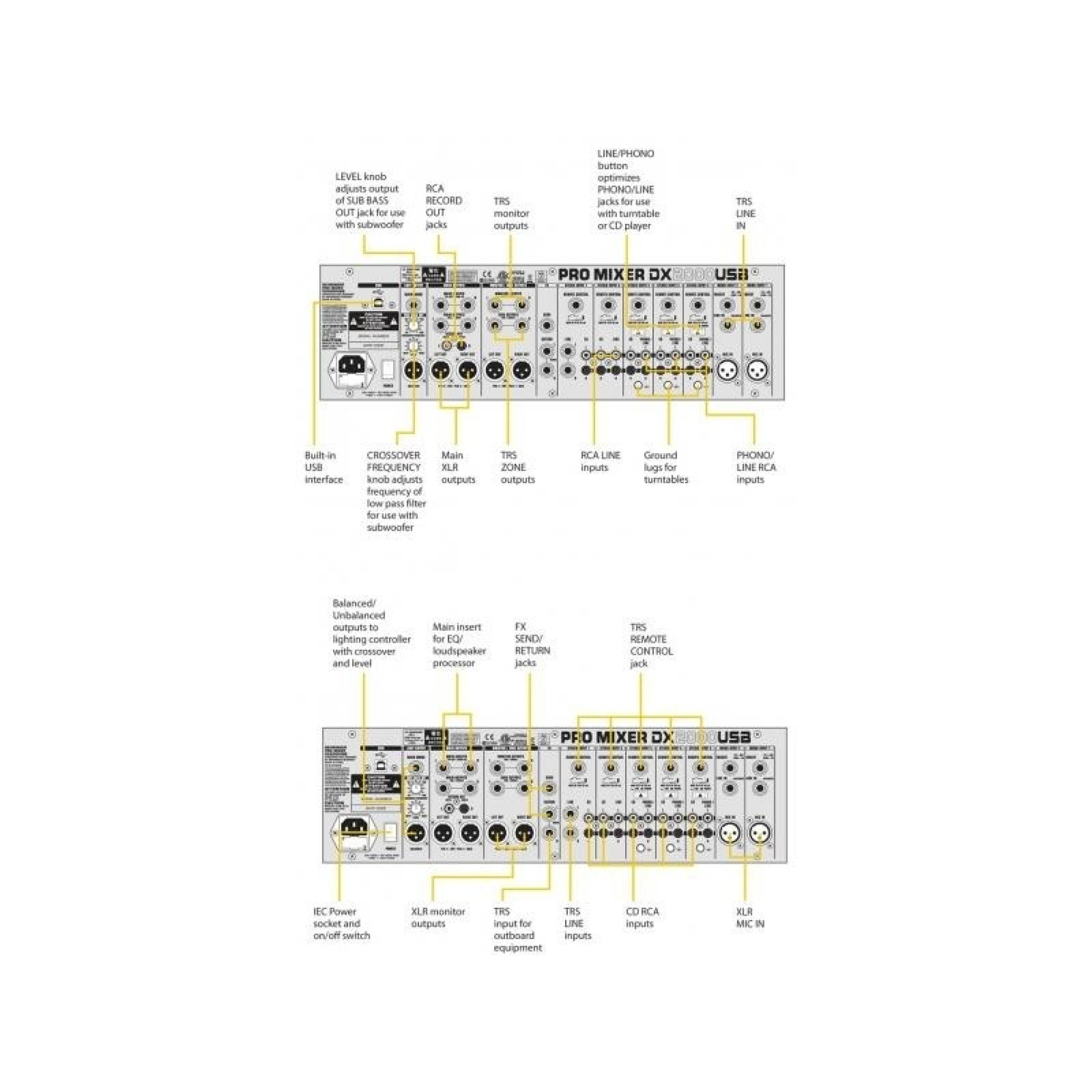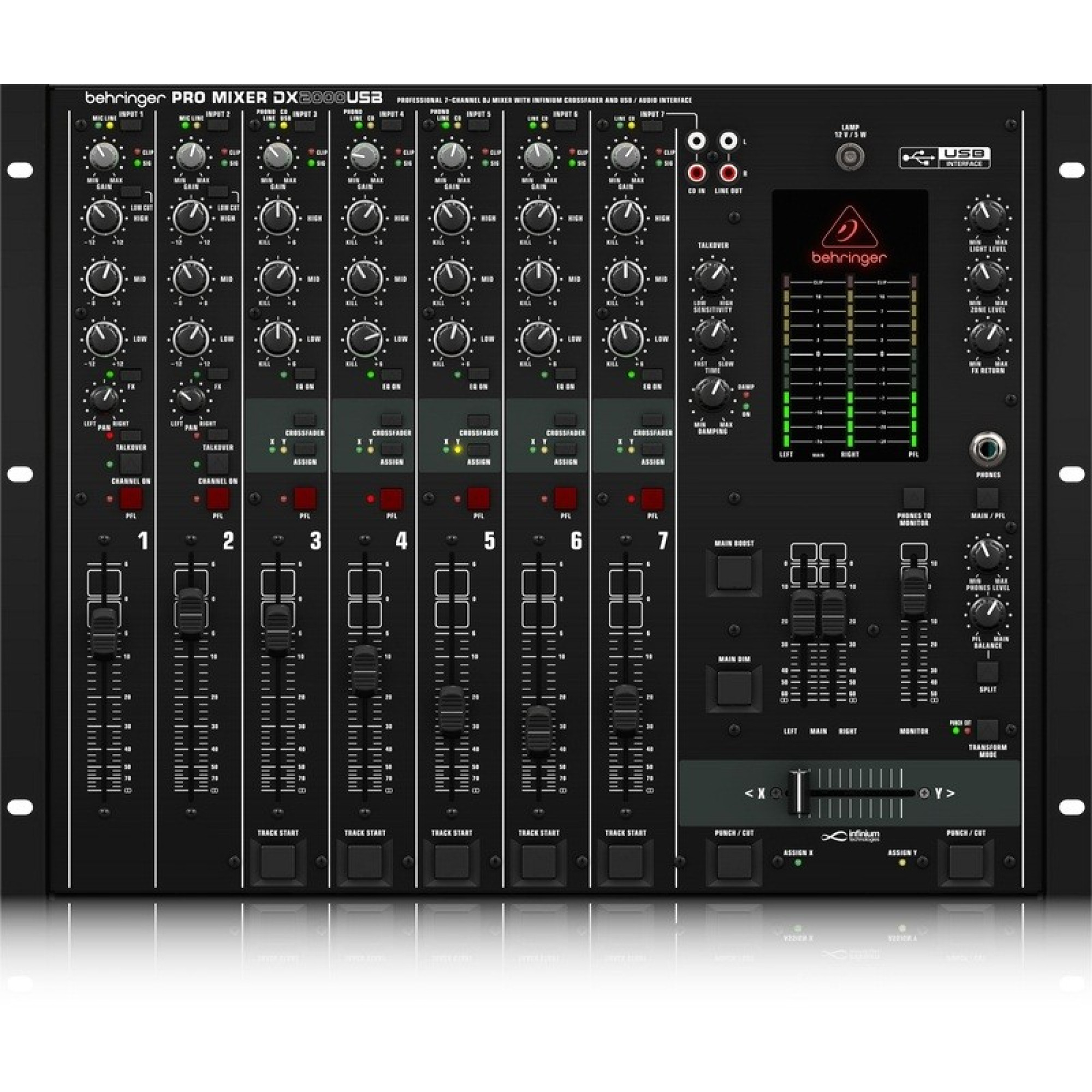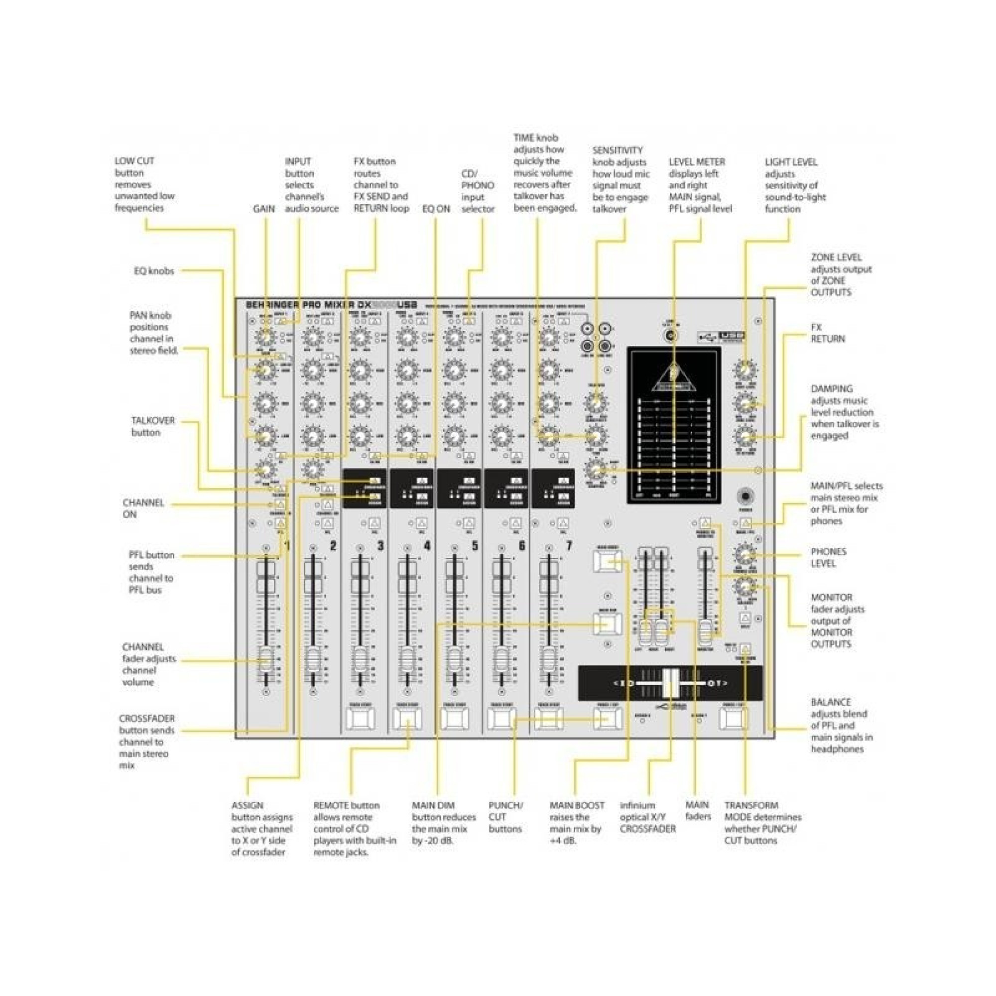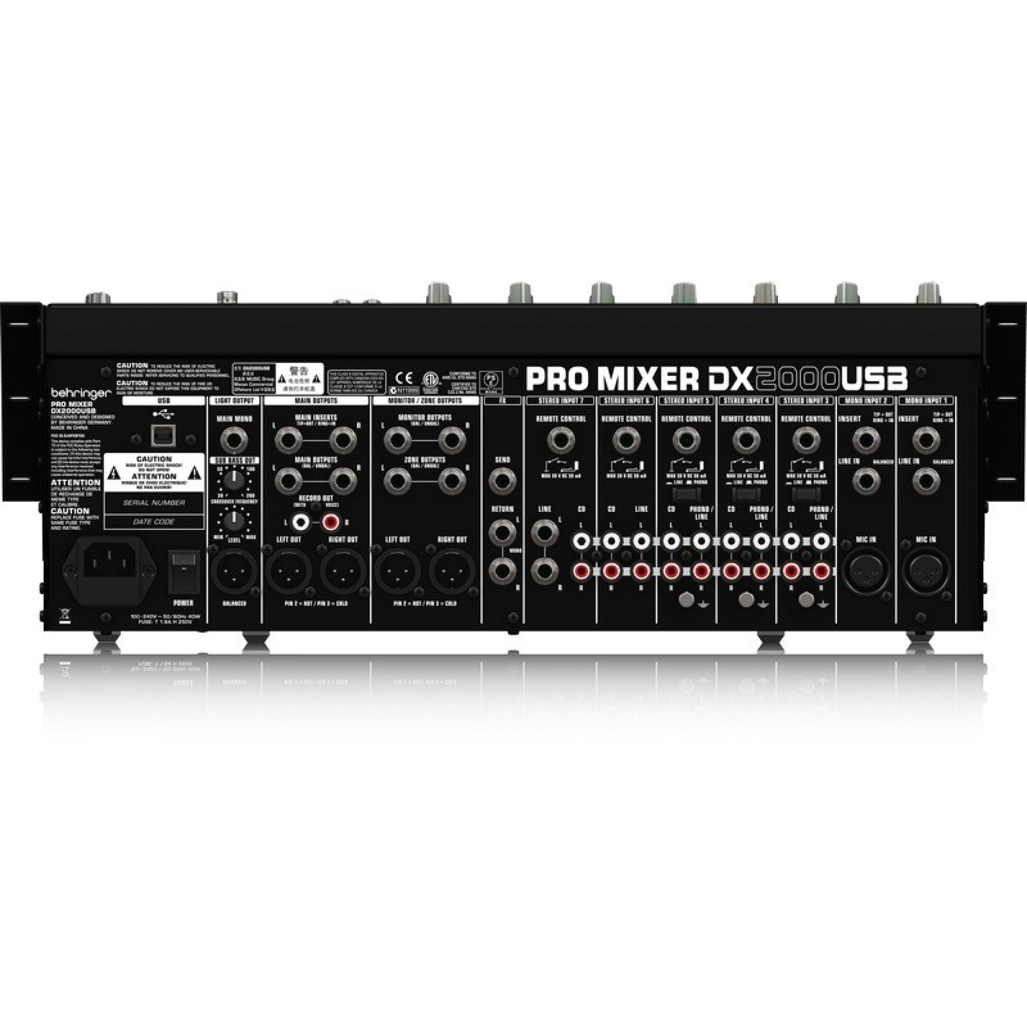 DX2000USB оснащений 3-смуговим еквалайзером усунення несправностей і регулятором посилення на канал. Моноканали оснащені додатковим перемикачем Low Cut і перемикачем FX, який направляє канал на петлю посилання і повернення ефектів, щоб мати можливість додати зовнішніх ефектів. Канали, які приймають мікрофони та лінійні джерела, також мають кнопку Talkover, Channel On і перемикач PFL для моніторингу навушників. Стереоканали мають перемикач увімкнення/вимкнення еквалайзера, а також Crossfader, що передає канал на основний стерео мікс. Кнопка Assign вибирає, чи буде канал відображатися на стороні кросфейдера X або Y. Для ді-джеїв, яким потрібен величезний бас, DX2000USB оснащений XLR Sub Bass Out (ідеально підходить для підключення до активного сабвуфер) із регульованою частотою кросовера (30–200 Гц) і спеціальним регулятором рівня. Безпосередньо над ним DX2000USB забезпечує основний моновихід для синхронізації найсильніших імпульсів музики з системою освітлення. Розділ основного виходу пропонує стереовиходи TRS 1/4" і XLR, а також входи TRS 1/4" для підключення зовнішніх еквалайзерів. У цьому розділі також є виходи RCA для запису міксу. Розділ виходу монітора/зони має стереовиходи TRS 1/4" і XLR для моніторів, а також стереовиходи зони.