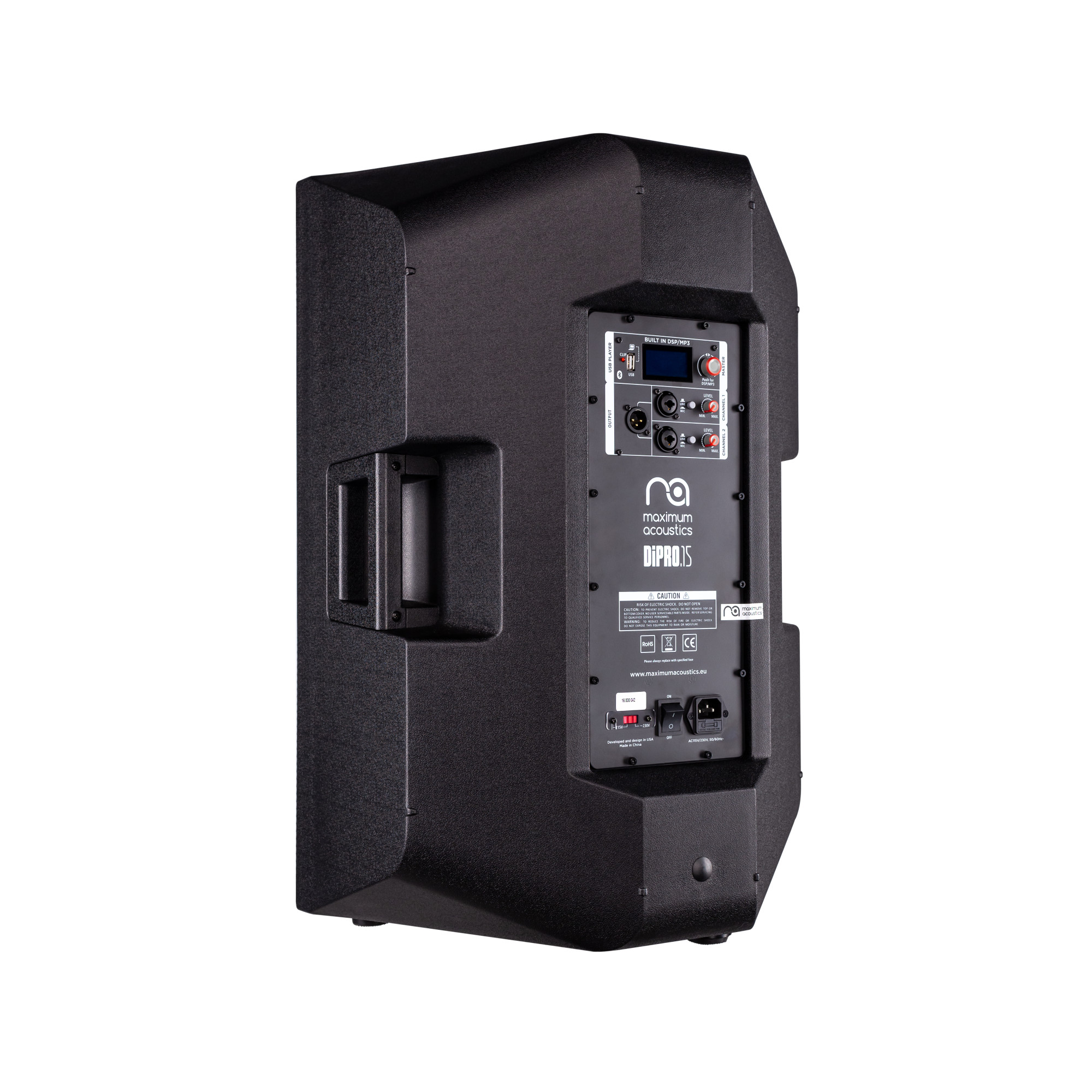 Maximum Acoustics DIPRO.15 – це двосмугова активна акустична система, що базується на потужному 15-дюймовому НЧ-динаміку та динамічному компресійному драйвері із титановою діафрагмою, та оснащена підсилювачем класу D. Легкий та міцний корпус з ABS-пластику оснащений чашкою для кріплення на стенд та прогумованими ніжками для зручного розташування акустичної системи за будь-яких умов. Повнорозмірна сталева решітка з порошковим покриттям забезпечує захист драйверів та професійний зовнішній вигляд. Система гучномовців розрахована на потужність RMS 500 Вт.