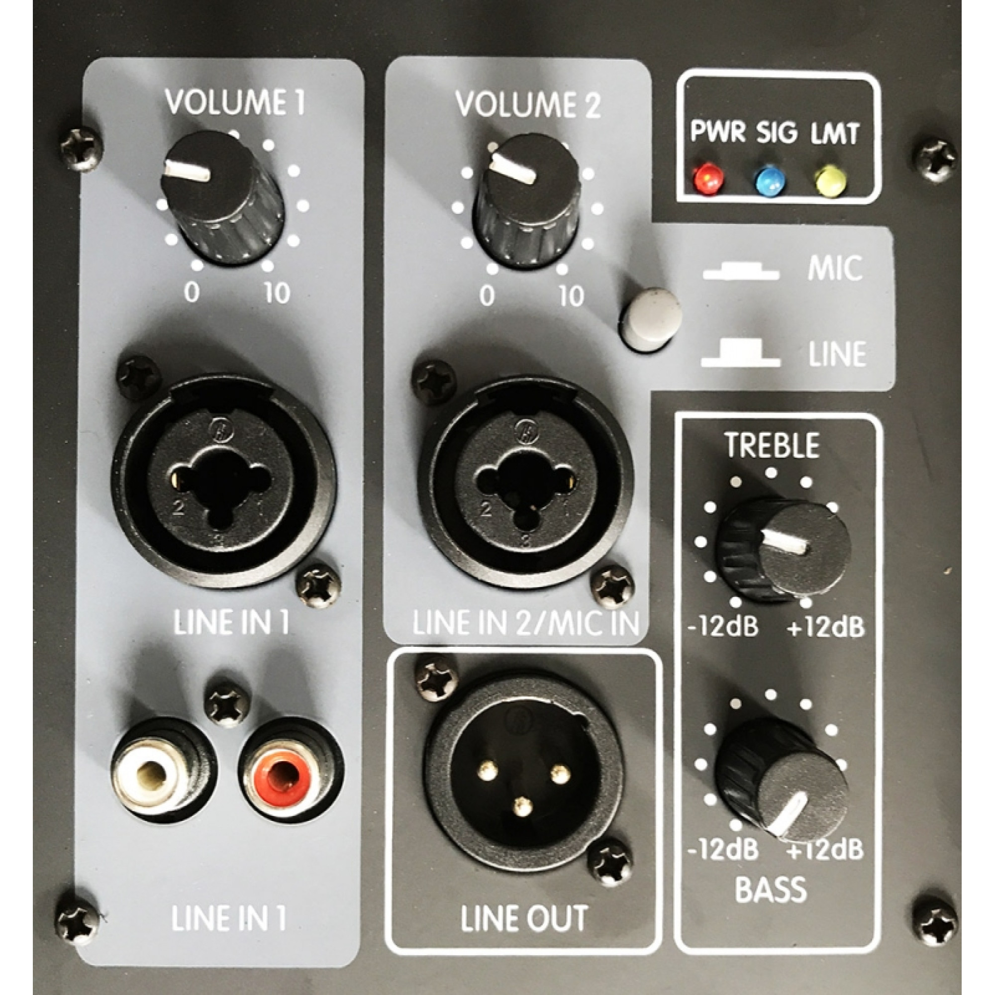 - Line In 1: універсальний лінійний вхід на XLR/Jack 6,3 мм і 2х RCA. Група роз'ємів обладнана незалежним регулятором гучності (Volume 1).