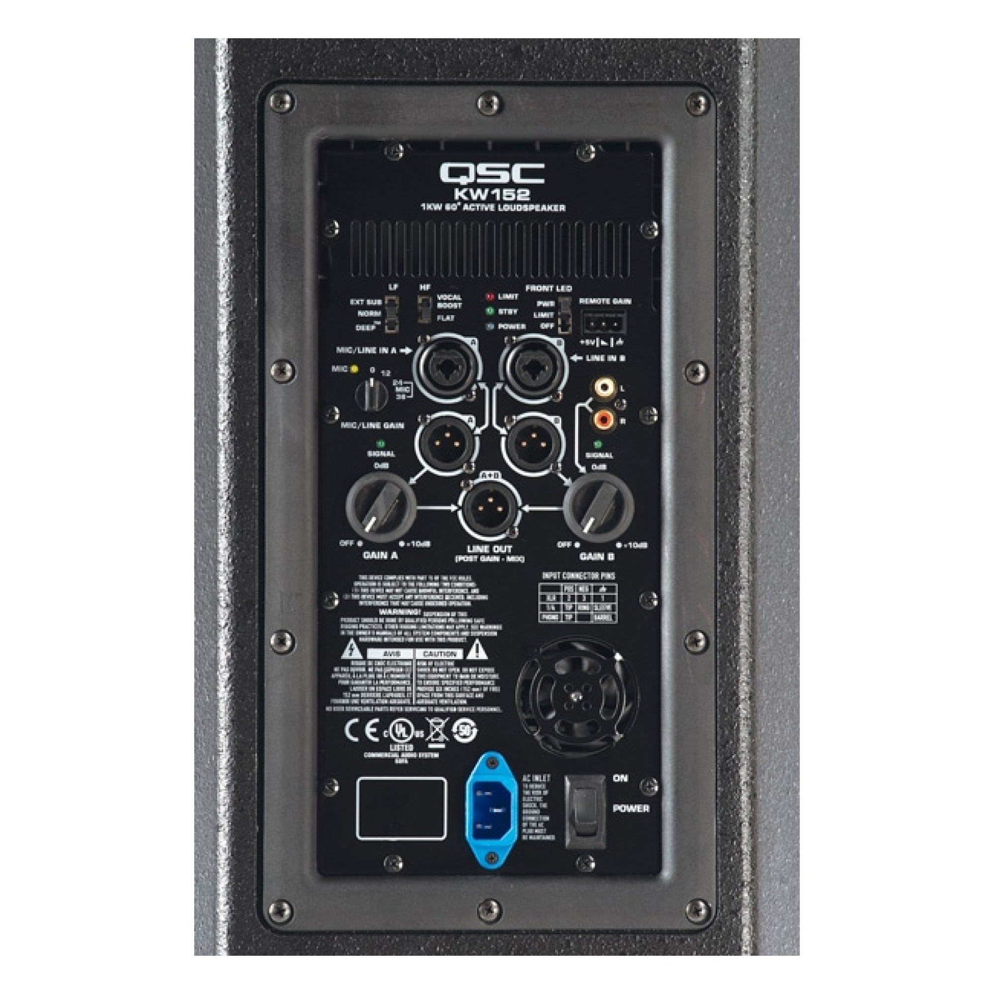 Загальна максимальна пікова сила звуку складає 133 дБ SPL, що забезпечує потужне звучання. Завдяки підсилювачам класу D, система ефективно використовує енергію і забезпечує стабільну роботу в будь-яких умовах. Активна акустична система QSC KW152 – це надійна і потужна система, що заповнить якісним а потужним звучанням простір навколо.