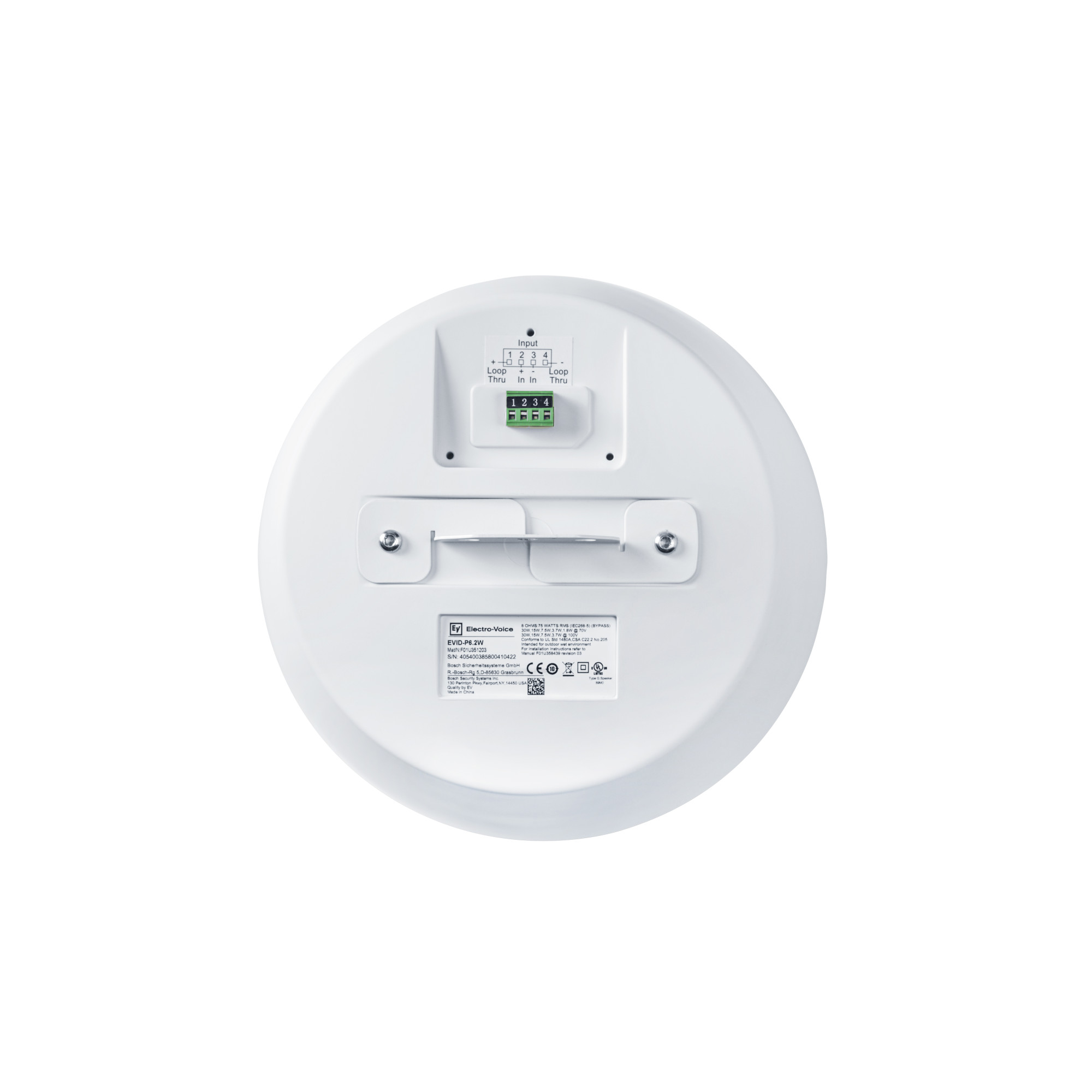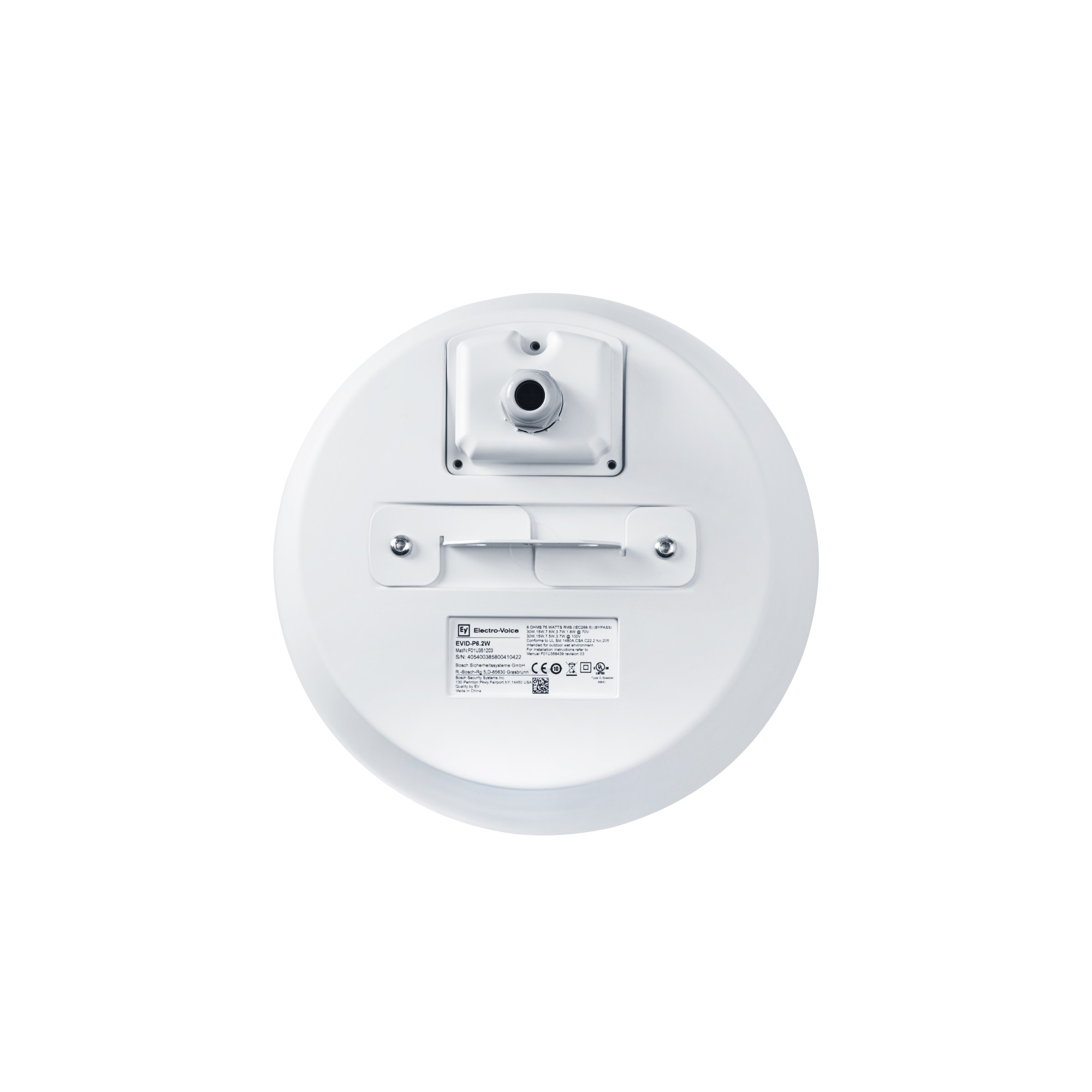 У гучномовці EVID-P6.2 використовується кросоверна мережа 2-го порядку з комплексною схемою захисту, що оберігає мережу, НЧ- та ВЧ-динаміки від надмірно високих рівнів потужності. В акустичній системі EVID-P6.2 використовується трансформатор, який дозволяє вибрати потужність 1,88 (тільки 70 В), 3,75 Вт, 7,5 Вт, 15 Вт або 30 Вт, що подається на акустичну систему лініями 70 В або 100 В, або в обхід 8 Ом. Вибір здійснюється за допомогою зручного перемикача на передній панелі, доступ до якого легко отримати, знявши магнітну решітку. Перфоровані грати пофарбовані напівглянсовою чорною або білою порошковою емаллю. Передня панель, рамка та задній корпус виготовлені з ABS-пластику із класом захисту UL 94V-0. Рознімання на задній панелі забезпечують доступ до 4-контактного клемного блоку, який дозволяє підключати колонки безпосередньо за допомогою проводів 12 калібру і забезпечує наскрізне підключення додаткових колонок.