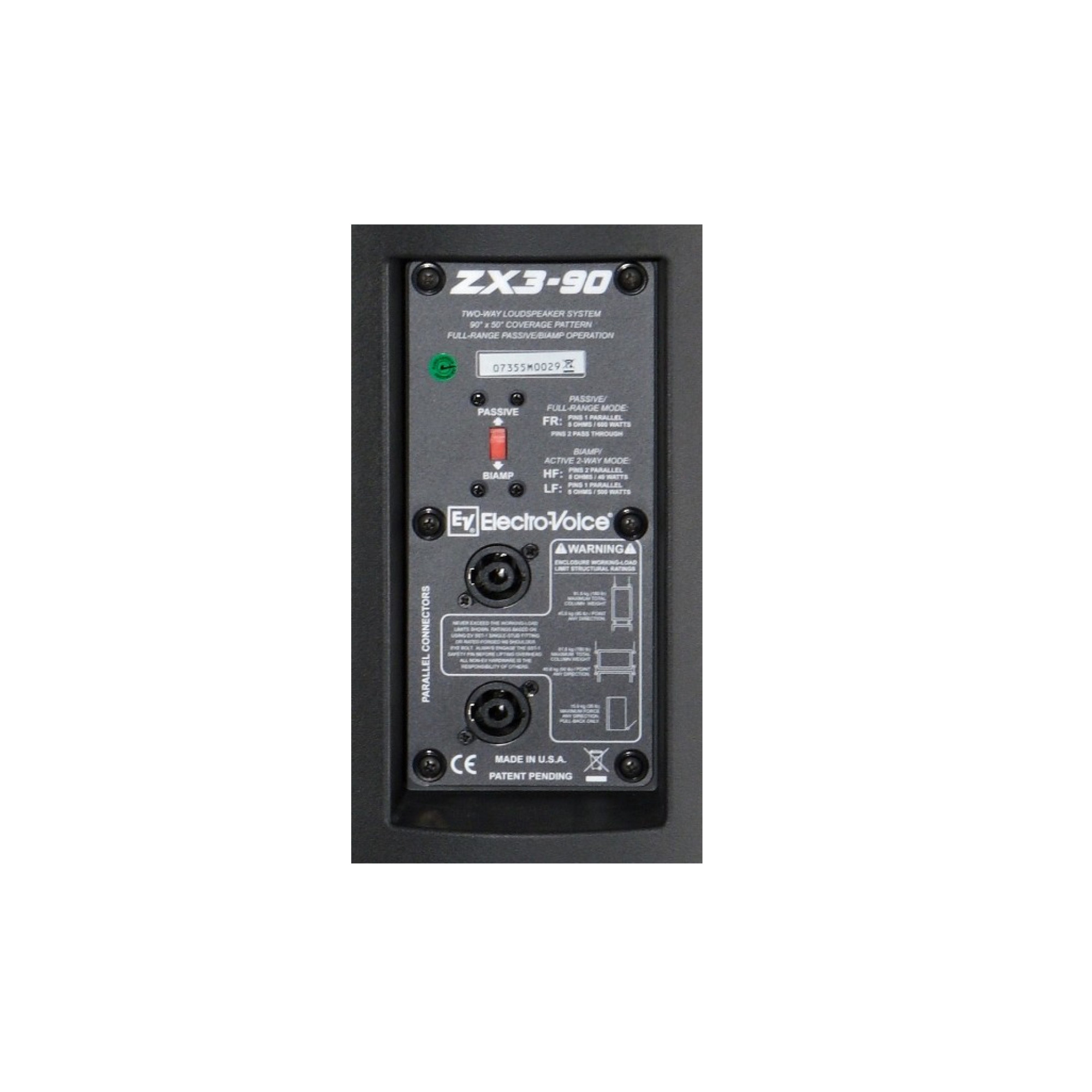 Electro-Voice Zx3-90B – це 2-смугова АС з кутами розкриття 90° x 50°, що забезпечує високу якість звучання. Оснащена новим 12" динаміком DVX-3121A і 2" неодимовим компресійним драйвером ND2 з вихідним отвором 1", забезпечує можливість застосування для широкого спектру завдань: від мобільних додатків – до стаціонарних інсталяцій, продовжуючи інноваційну програму динаміків DVX. Кабінет ZX3 в порівнянні з ZX5 при тій же потужності має більш компактний розмір. У ZX3 краще узгоджені НЧ і ВЧ динаміки, що дає більш рівну характеристику в середніх частотах, і, як наслідок, краще відтворює мовний та вокальний діапазон. Маючи менший НЧ динамік (12" у порівнянні з 15"), дана АС має більш "різке" звучання. Надалі для досягнення найбільш повного звучання рекомендується придбати також окремий низькочастотний кабінет.