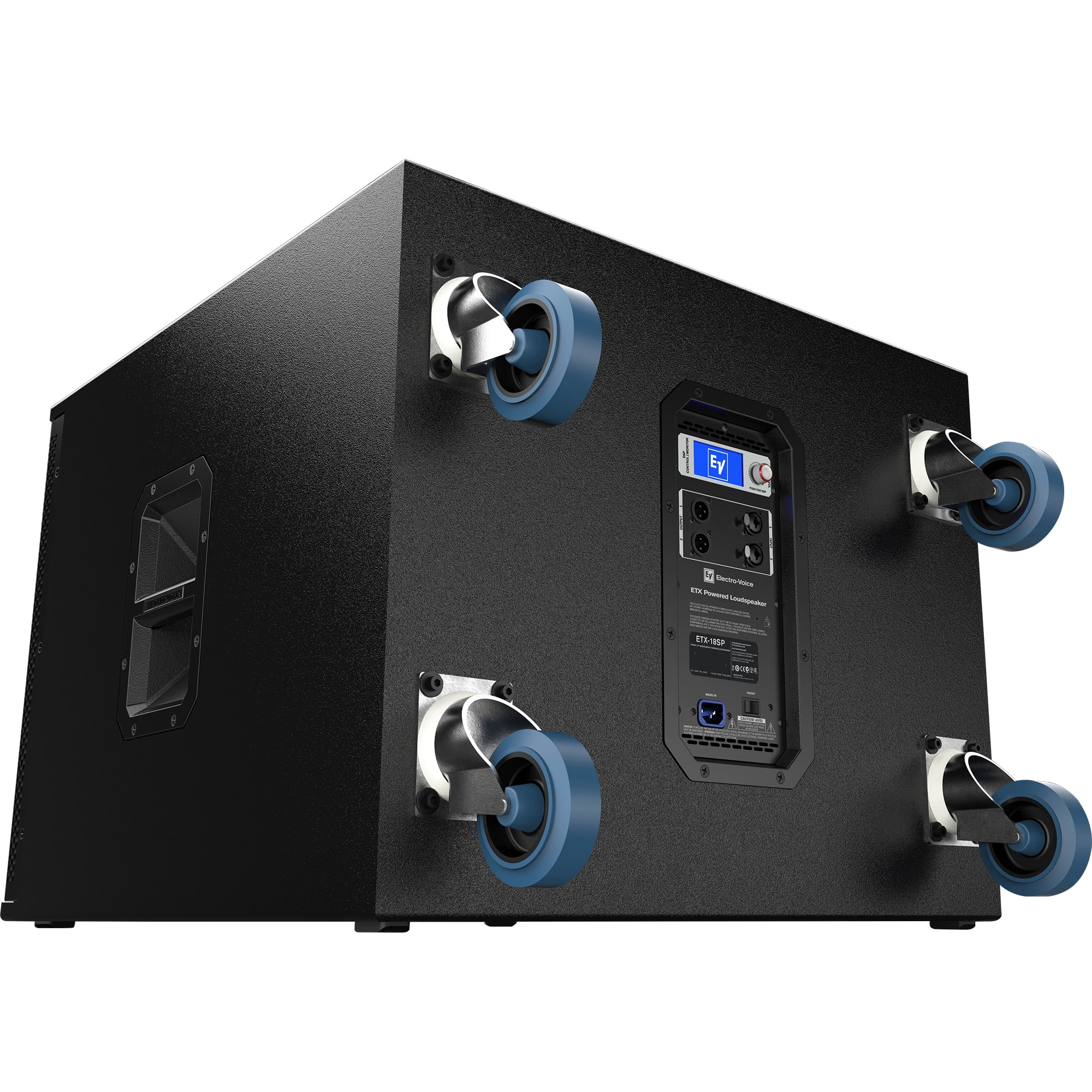 Активний сабвуфер Electro-Voice ETX-18SP має на борту 18-дюймовий динамік, а також DSP-модуль, РК-дисплей і ручку для керування налаштуваннями. Вуфер має довгий термін служби та підвищену механічну надійність. При цьому він має низький рівень спотворень, рівну частотну характеристику і високий рівень звукового тиску на максимальній потужності ETX-18SP здатний досягати пікової потужності в 1800 Вт. Має температурний лімітер та піковий лімітер. Інформація про перевантаження відображається на РК-екрані, а також на LED-індикаторах, розташованих на лицьовій стороні. 2 вікна фазоінвертора поруч із вуфером розширюють НЧ діапазон, мінімізують спотворення та стоячі хвилі всередині системи.