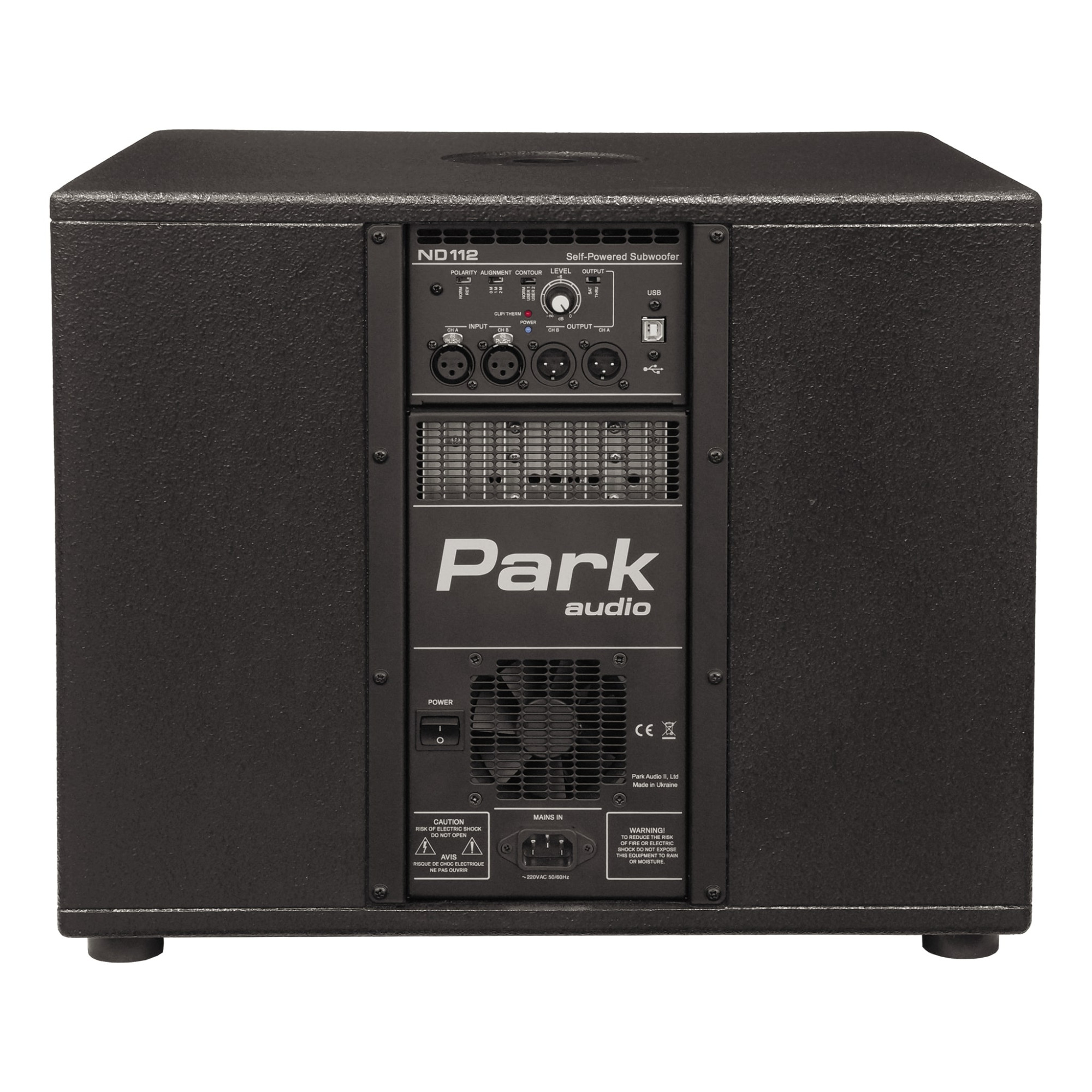 Активний сабвуфер Park Audio ND112-P з 12-дюймовим динаміком відмінно підходить для клубів, барів, ресторанів, музичних гуртів, для внутрішнього та зовнішнього використання. Корпус виконаний із березової фанери з чорним водно-полімерним покриттям. Додатковий захист від вологи забезпечує акустично-прозорий пінопласт, приклеєний на внутрішню поверхню решітки. Дві ергономічні ручки для перенесення розташовані з обох боків. Фланець для стійки колонки розташований у верхній частині сабвуфера. Підсилювач класу D (700Вт) встановлений в ізольованому відсіку ззаду. Підсилювач оснащений захистом від навантаження, короткого замикання та перегріву. Підсилювач має імпульсне джерело живлення та систему примусового охолодження з плавно регульованою інтенсивністю.