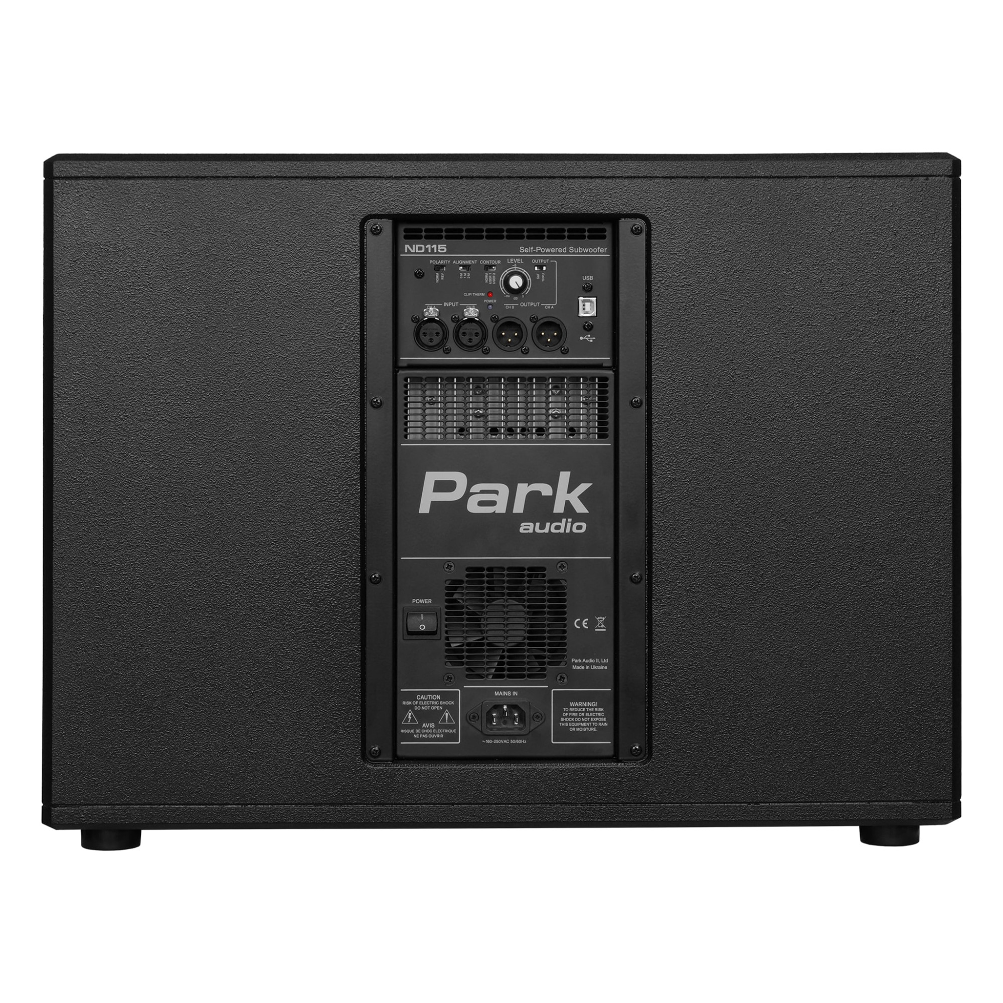 Активний сабвуфер Park Audio ND115-P з 15-дюймовим динаміком відмінно підходить для клубів, барів, ресторанів, музичних гуртів, для внутрішнього та зовнішнього використання. Корпус виконаний із березової фанери з чорним водно-полімерним покриттям. Додатковий захист від вологи забезпечує акустично-прозорий пінопласт, приклеєний на внутрішню поверхню решітки. Дві ергономічні ручки для перенесення розташовані з обох боків. Фланець для стійки колонки розташований у верхній частині сабвуфера. Підсилювач класу D (1000Вт) встановлений в ізольованому відсіку ззаду. Підсилювач оснащений захистом від навантаження, короткого замикання та перегріву. Підсилювач має імпульсне джерело живлення та систему примусового охолодження з плавно регульованою інтенсивністю.